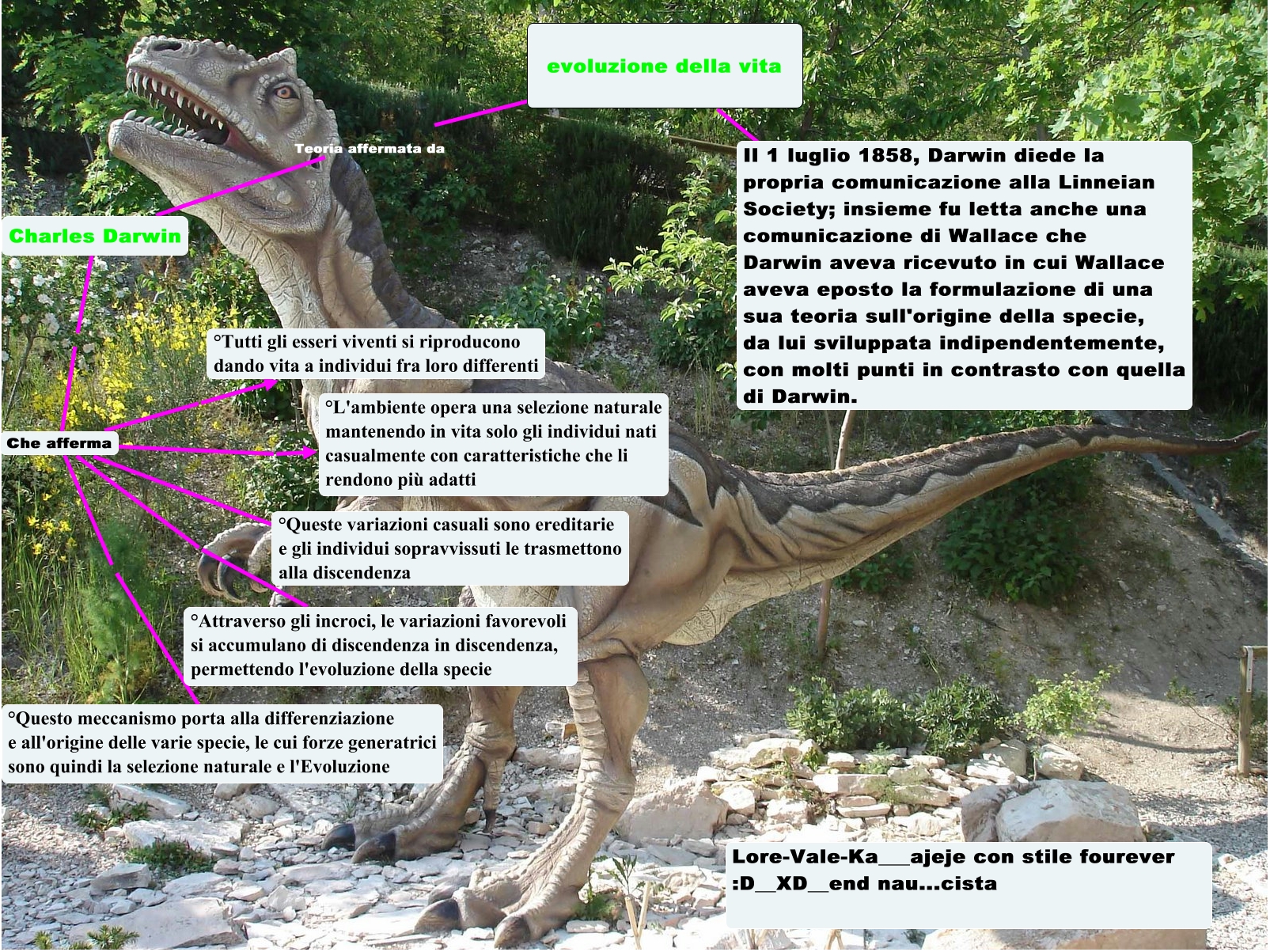 Questa Cmap, creata con IHMC CmapTools, contiene informazioni relative a: evoluzione lore-vale-ca-, che afferma ???? °Queste variazioni casuali sono ereditarie e gli individui sopravvissuti le trasmettono alla discendenza, Charles Darwin che afferma, evoluzione della vita Teoria affermata da Charles Darwin, che afferma °L'ambiente opera una selezione naturale mantenendo in vita solo gli individui nati casualmente con caratteristiche che li rendono più adatti, che afferma °Attraverso gli incroci, le variazioni favorevoli si accumulano di discendenza in discendenza, permettendo l'evoluzione della specie, che afferma °Questo meccanismo porta alla differenziazione e all'origine delle varie specie, le cui forze generatrici sono quindi la selezione naturale e l'Evoluzione, che afferma °Tutti gli esseri viventi si riproducono dando vita a individui fra loro differenti, evoluzione della vita Il 1 luglio 1858, Darwin diede la propria comunicazione alla Linneian Society; insieme fu letta anche una comunicazione di Wallace che Darwin aveva ricevuto in cui Wallace aveva eposto la formulazione di una sua teoria sull'origine della specie, da lui sviluppata indipendentemente, con molti punti in contrasto con quella di Darwin.
