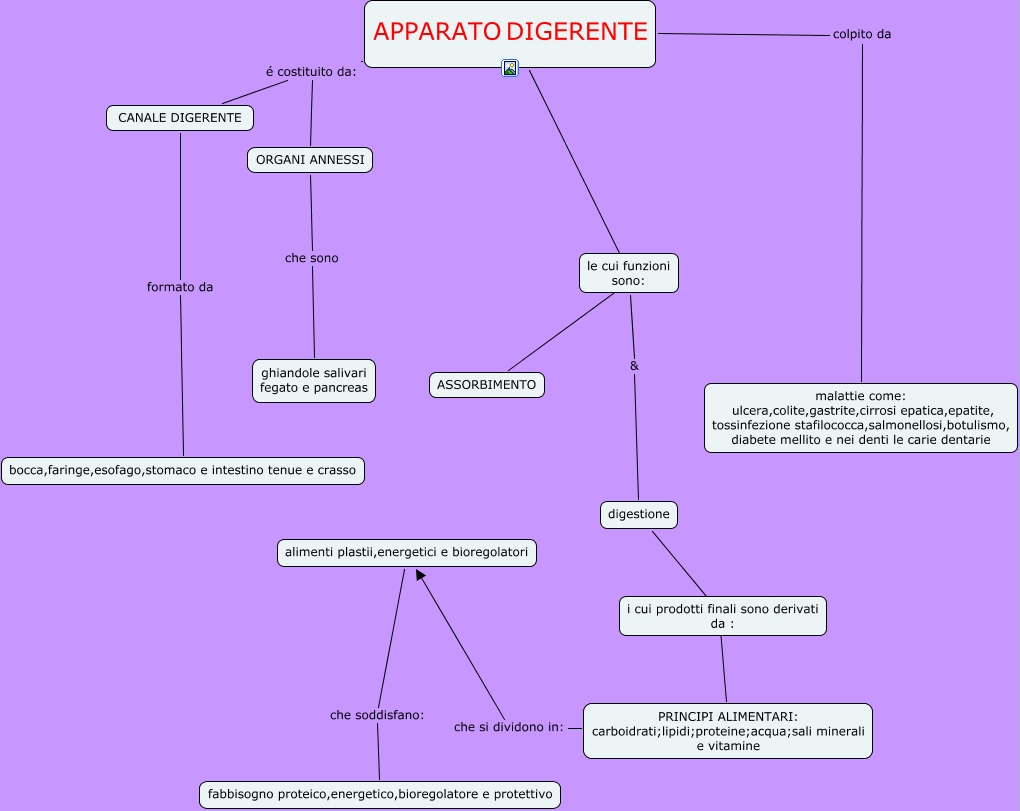 Questa Cmap, creata con IHMC CmapTools, contiene informazioni relative a: app. digerente Nik e, APPARATO DIGERENTE colpito da malattie come: ulcera,colite,gastrite,cirrosi epatica,epatite, tossinfezione stafilococca,salmonellosi,botulismo, diabete mellito e nei denti le carie dentarie, APPARATO DIGERENTE é costituito da: CANALE DIGERENTE, ORGANI ANNESSI che sono ghiandole salivari fegato e pancreas, PRINCIPI ALIMENTARI: carboidrati;lipidi;proteine;acqua;sali minerali e vitamine che si dividono in: alimenti plastii,energetici e bioregolatori, APPARATO DIGERENTE ???? ASSORBIMENTO, digestione i cui PRINCIPI ALIMENTARI: carboidrati;lipidi;proteine;acqua;sali minerali e vitamine, le cui funzioni sono: & digestione, CANALE DIGERENTE formato da bocca,faringe,esofago,stomaco e intestino tenue e crasso, APPARATO DIGERENTE é costituito da: ORGANI ANNESSI, alimenti plastii,energetici e bioregolatori che soddisfano: fabbisogno proteico,energetico,bioregolatore e protettivo