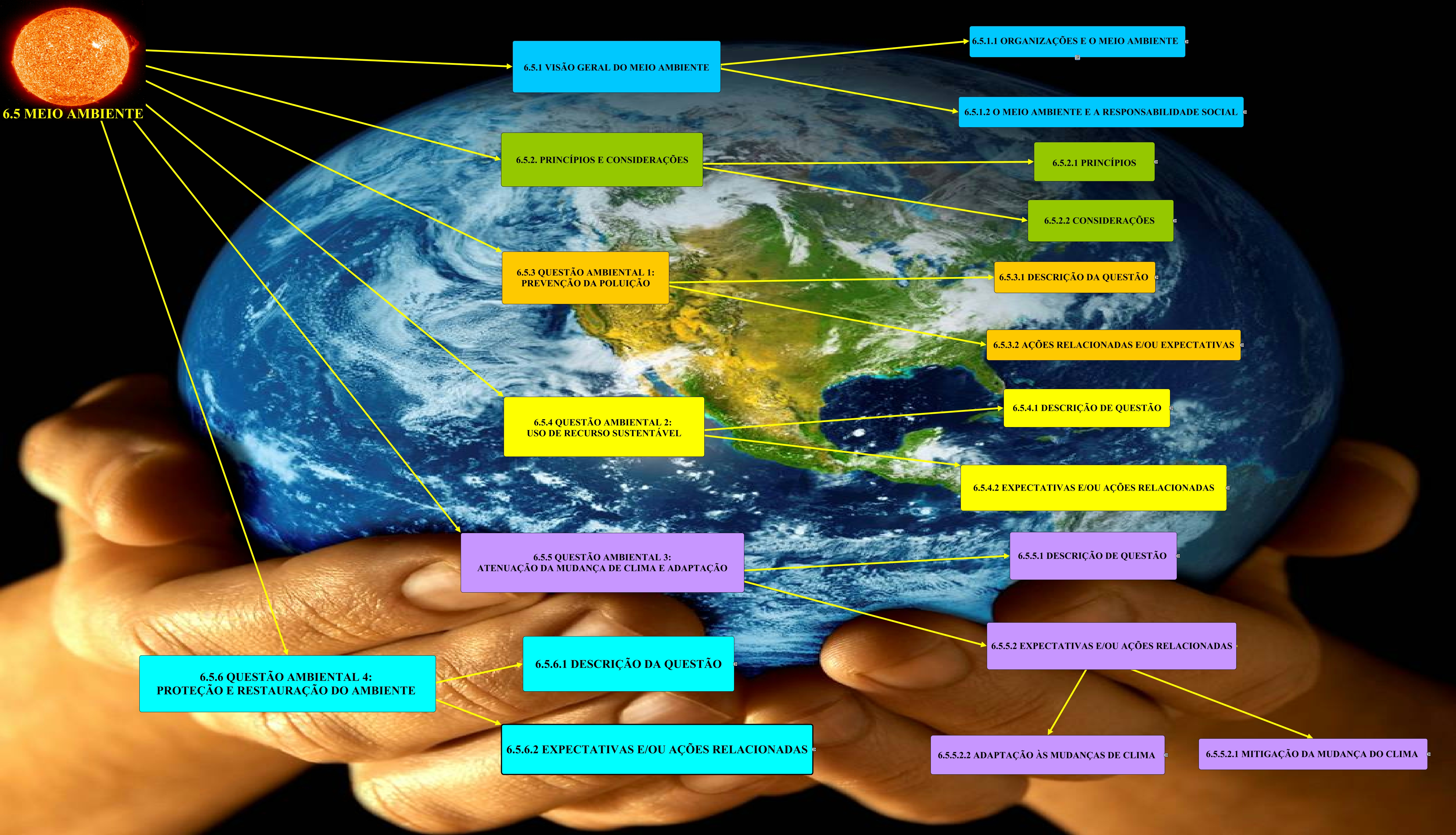 Esse mapa conceitual, produzido no IHMC CmapTools, tem a informação relacionada a: 6.5.0 Meio ambiente (FINALIZADO), Questões sociais são Efeito na saúde, Organizações praticam Decisões e atividades, UMA ORGANIZAÇÃO deveria IMPLEMENTAR UM PROGRAMA PARA COIBIR ACIDENTES E INCIDENTES, 6.5.2.2 CONSIDERAÇÕES incluem uma abordagem de sistema de produto-serviço, implantar medidas de eficiência de recursos para reduzir Outros materiais, A POLUIÇÃO que inclui EMISSÕES AO AR, educação ambiental é fundamental para promover estilo de vida sustentável, 6.5.3 QUESTÃO AMBIENTAL 1: PREVENÇÃO DA POLUIÇÃO ???? 6.5.3.2 AÇÕES RELACIONADAS E/OU EXPECTATIVAS, Uma organização deveria Medir, registrar e reportar as emissões de GHG, educação ambiental é fundamental para promover desevolvimento de sociedade, Crescimento da população implicam destruição do habitat, UMA ORGANIZAÇÃO deveria IMPLEMENTAR MEDIDAS PARA REDUÇÃO DE RESÍDUOS, Uma organização deveria identificar Medir, registrar e reportar o uso dos recursos, 6.5.4 QUESTÃO AMBIENTAL 2: USO DE RECURSO SUSTENTÁVEL ???? 6.5.4.2 EXPECTATIVAS E/OU AÇÕES RELACIONADAS, 6.5.5.2 EXPECTATIVAS E/OU AÇÕES RELACIONADAS ???? 6.5.5.2.2 ADAPTAÇÃO ÀS MUDANÇAS DE CLIMA, Emissões do gás do efeito estufa (greenhouse gas - GHG) são as causas prováveis Mudança no clima global, Responsabilidade social engloba participação da comunidade, Questões sociais são Nos direitos humanos, Uma organização deve agir para Protejer o ecossistema, OUTRAS FORMAS IDENTIFICÁVEIS DE POLUIÇÃO podendo ser AGENTES INFECCIOSOS
