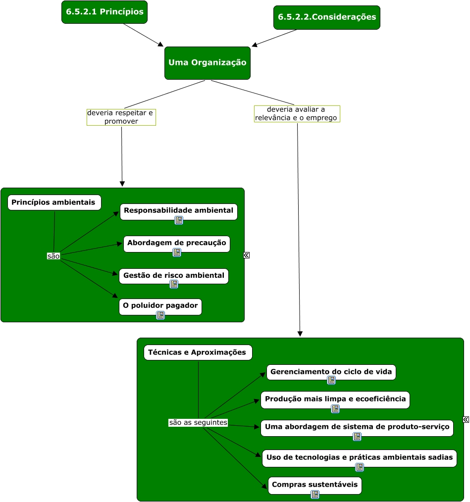 Esse mapa conceitual, produzido no IHMC CmapTools, tem a informação relacionada a: 6.5.2 Princípios, Princípios ambientais são Gestão de risco ambiental, Princípios ambientais são Responsabilidade ambiental, Uma Organização deveria avaliar a relevância e o emprego Das Técnicas e aproximações, Técnicas e Aproximações são as seguintes Compras sustentáveis, Técnicas e Aproximações são as seguintes Uma abordagem de sistema de produto-serviço, Técnicas e Aproximações são as seguintes Gerenciamento do ciclo de vida, 6.5.2.2.Considerações ???? Uma Organização, Técnicas e Aproximações são as seguintes Produção mais limpa e ecoeficiência, Princípios ambientais são O poluidor pagador, Princípios ambientais são Abordagem de precaução, 6.5.2.1 Princípios ???? Uma Organização, Técnicas e Aproximações são as seguintes Uso de tecnologias e práticas ambientais sadias, Uma Organização deveria respeitar e promover Os Princípios ambientais