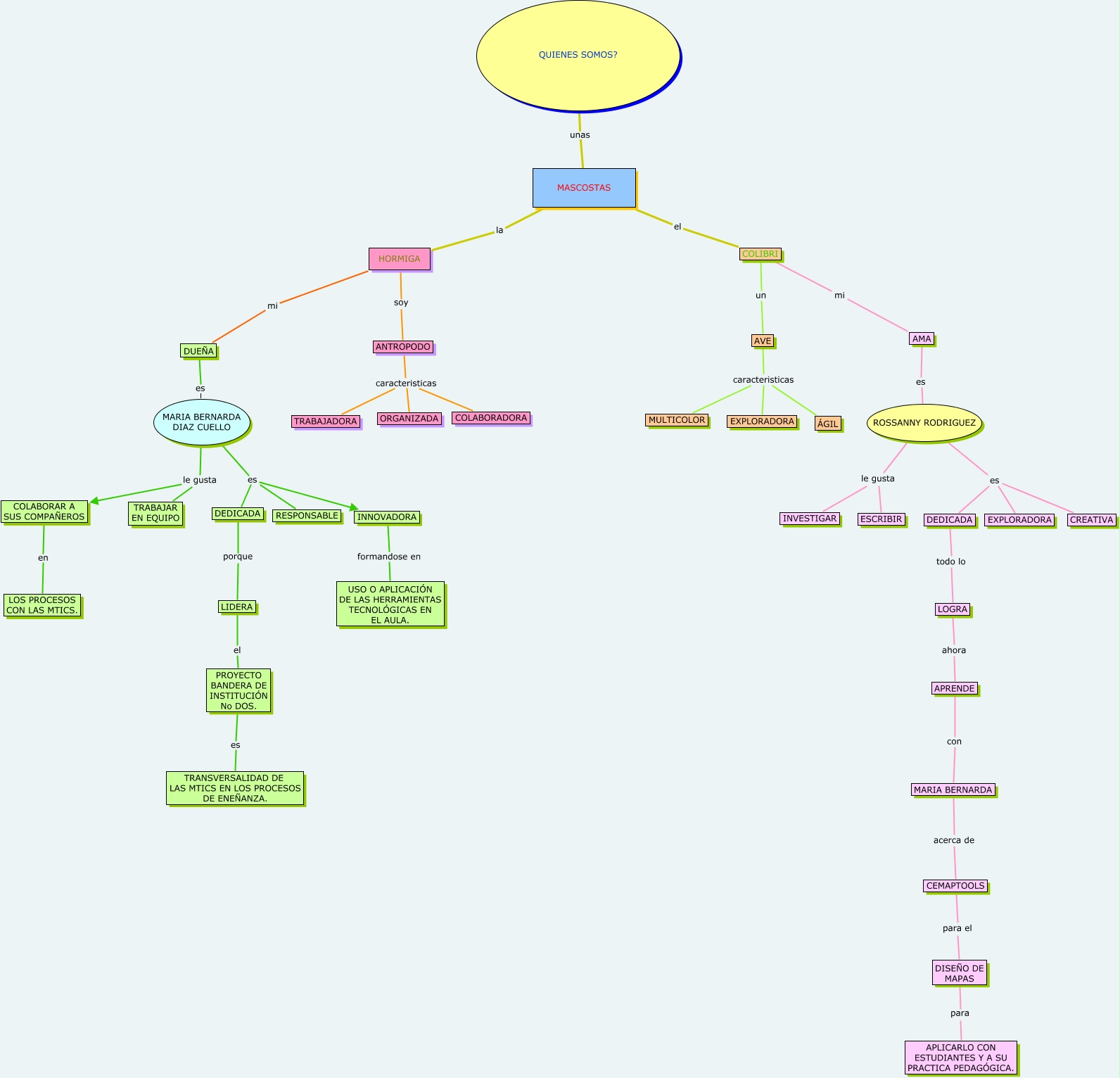 Este Cmap, tiene información relacionada con: ROSSANNY DOS, MARIA BERNARDA DIAZ CUELLO le gusta COLABORAR A SUS COMPAÑEROS, COLIBRI mi AMA, DEDICADA porque LIDERA, AVE caracteristicas ÁGIL, QUIENES SOMOS? unas MASCOSTAS, ANTROPODO caracteristicas TRABAJADORA, COLABORAR A SUS COMPAÑEROS en LOS PROCESOS CON LAS MTICS., DUEÑA es MARIA BERNARDA DIAZ CUELLO, PROYECTO BANDERA DE INSTITUCIÓN No DOS. es TRANSVERSALIDAD DE LAS MTICS EN LOS PROCESOS DE ENEÑANZA., MASCOSTAS la HORMIGA, HORMIGA soy ANTROPODO, MARIA BERNARDA DIAZ CUELLO es INNOVADORA, MARIA BERNARDA DIAZ CUELLO le gusta TRABAJAR EN EQUIPO, MARIA BERNARDA acerca de CEMAPTOOLS, AMA es ROSSANNY RODRIGUEZ, DEDICADA todo lo LOGRA, DISEÑO DE MAPAS para APLICARLO CON ESTUDIANTES Y A SU PRACTICA PEDAGÓGICA., ROSSANNY RODRIGUEZ le gusta ESCRIBIR, ROSSANNY RODRIGUEZ es DEDICADA, COLIBRI un AVE