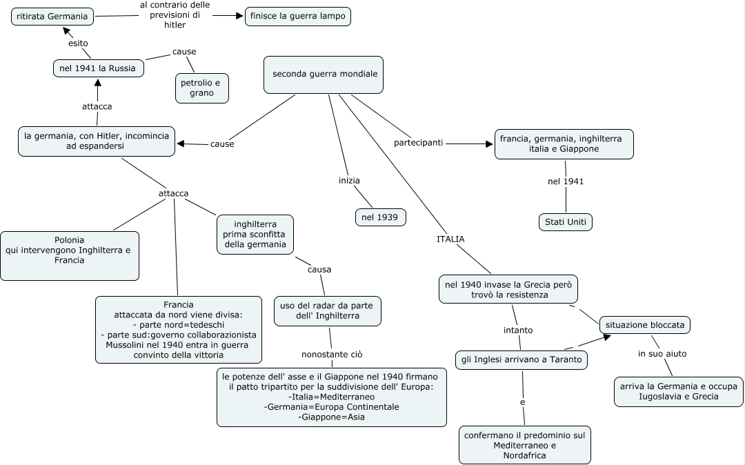 Questa Cmap, creata con IHMC CmapTools, contiene informazioni relative a: mappa storia Giada, la germania, con Hitler, incomincia ad espandersi attacca Polonia qui intervengono Inghilterra e Francia, seconda guerra mondiale ITALIA nel 1940 invase la Grecia però trovò la resistenza, seconda guerra mondiale inizia nel 1939, uso del radar da parte dell' Inghilterra nonostante ciò le potenze dell' asse e il Giappone nel 1940 firmano il patto tripartito per la suddivisione dell' Europa: -Italia=Mediterraneo -Germania=Europa Continentale -Giappone=Asia, francia, germania, inghilterra italia e Giappone nel 1941 Stati Uniti, la germania, con Hitler, incomincia ad espandersi attacca nel 1941 la Russia, ritirata Germania al contrario delle previsioni di hitler finisce la guerra lampo, nel 1941 la Russia cause petrolio e grano, la germania, con Hitler, incomincia ad espandersi attacca inghilterra prima sconfitta della germania, inghilterra prima sconfitta della germania causa uso del radar da parte dell' Inghilterra, la germania, con Hitler, incomincia ad espandersi attacca Francia attaccata da nord viene divisa: - parte nord=tedeschi - parte sud:governo collaborazionista Mussolini nel 1940 entra in guerra convinto della vittoria, seconda guerra mondiale partecipanti francia, germania, inghilterra italia e Giappone, nel 1940 invase la Grecia però trovò la resistenza situazione bloccata, situazione bloccata in suo aiuto arriva la Germania e occupa Iugoslavia e Grecia, seconda guerra mondiale cause la germania, con Hitler, incomincia ad espandersi, gli Inglesi arrivano a Taranto e confermano il predominio sul Mediterraneo e Nordafrica, nel 1940 invase la Grecia però trovò la resistenza intanto gli Inglesi arrivano a Taranto, nel 1941 la Russia esito ritirata Germania, gli Inglesi arrivano a Taranto situazione bloccata