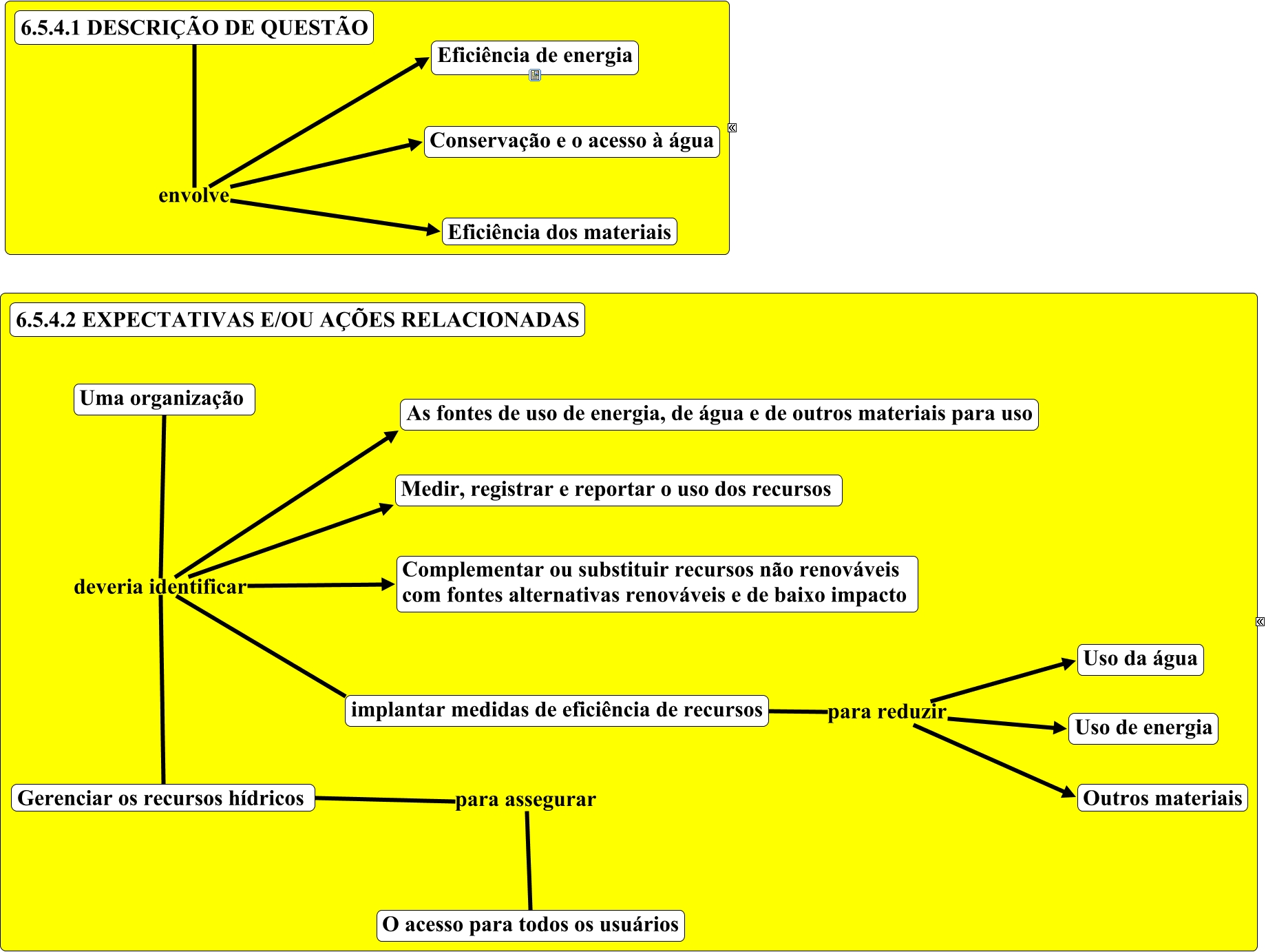 Esse mapa conceitual, produzido no IHMC CmapTools, tem a informação relacionada a: 6.5.4 Questão ambiental 2, Uma organização deveria identificar Medir, registrar e reportar o uso dos recursos, implantar medidas de eficiência de recursos para reduzir Uso da água, Uma organização deveria identificar Gerenciar os recursos hídricos, 6.5.4.1 DESCRIÇÃO DE QUESTÃO envolve Eficiência de energia, 6.5.4.1 DESCRIÇÃO DE QUESTÃO envolve Eficiência dos materiais, Uma organização deveria identificar implantar medidas de eficiência de recursos, 6.5.4.1 DESCRIÇÃO DE QUESTÃO envolve Conservação e o acesso à água, Gerenciar os recursos hídricos para assegurar O acesso para todos os usuários, implantar medidas de eficiência de recursos para reduzir Uso de energia, Uma organização deveria identificar Complementar ou substituir recursos não renováveis com fontes alternativas renováveis e de baixo impacto, implantar medidas de eficiência de recursos para reduzir Outros materiais, Uma organização deveria identificar As fontes de uso de energia, de água e de outros materiais para uso