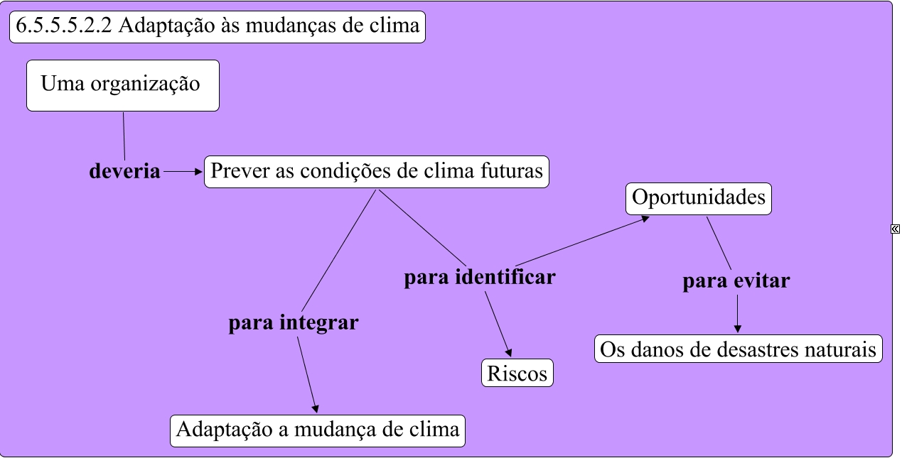 Esse mapa conceitual, produzido no IHMC CmapTools, tem a informação relacionada a: 6.5.5.2.2 Adaptação às mudanças de clima, Prever as condições de clima futuras para identificar Oportunidades, Uma organização deveria Prever as condições de clima futuras, Oportunidades para evitar Os danos de desastres naturais, Prever as condições de clima futuras para integrar Adaptação a mudança de clima, Prever as condições de clima futuras para identificar Riscos