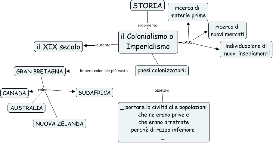 Questa Cmap, creata con IHMC CmapTools, contiene informazioni relative a: mappa concettuale sul colonialismo MASINI & TRUZZI, il Colonialismo o Imperialismo CAUSE ricerca di materie prime, il Colonialismo o Imperialismo durante il XIX secolo, STORIA argomento il Colonialismo o Imperialismo, GRAN BRETAGNA colonie CANADA, il Colonialismo o Imperialismo CAUSE ricerca di nuovi mercati, GRAN BRETAGNA colonie NUOVA ZELANDA, paesi colonizzatori: impero coloniale più vasto GRAN BRETAGNA, il Colonialismo o Imperialismo CAUSE individuazione di nuovi insediamenti, GRAN BRETAGNA colonie SUDAFRICA, paesi colonizzatori: obiettivi _ portare la civiltà alle popolazioni che ne erano prive e che erano arretrate perchè di razza inferiore _, il Colonialismo o Imperialismo ???? paesi colonizzatori:, GRAN BRETAGNA colonie AUSTRALIA