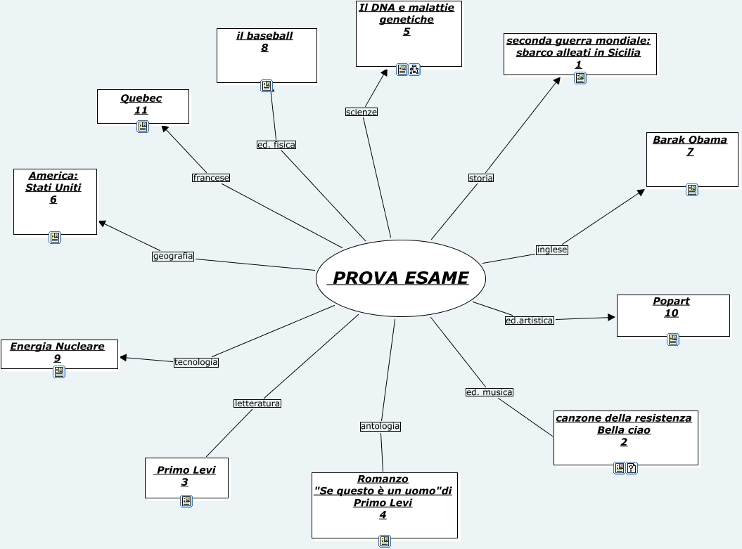 Questa Cmap, creata con IHMC CmapTools, contiene informazioni relative a: prova d' esame - claudio casale, PROVA ESAME scienze Il DNA e malattie genetiche 5, PROVA ESAME ed. fisica il baseball 8, PROVA ESAME inglese Barak Obama 7, PROVA ESAME letteratura Primo Levi 3, PROVA ESAME antologia Romanzo "Se questo è un uomo"di Primo Levi 4, PROVA ESAME storia seconda guerra mondiale: sbarco alleati in Sicilia 1, PROVA ESAME ed. musica canzone della resistenza Bella ciao 2, PROVA ESAME francese Quebec 11, PROVA ESAME tecnologia Energia Nucleare 9, PROVA ESAME ed.artistica Popart 10, PROVA ESAME geografia America: Stati Uniti 6