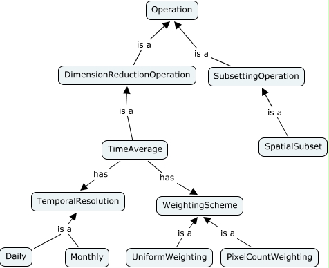 This Concept Map, created with IHMC CmapTools, has information related to: MDSA_UseCase1_v0, Daily is a TemporalResolution, TimeAverage has WeightingScheme, SubsettingOperation is a Operation, TimeAverage is a DimensionReductionOperation, UniformWeighting is a WeightingScheme, TimeAverage has TemporalResolution, DimensionReductionOperation is a Operation, Monthly is a TemporalResolution, SpatialSubset is a SubsettingOperation, PixelCountWeighting is a WeightingScheme