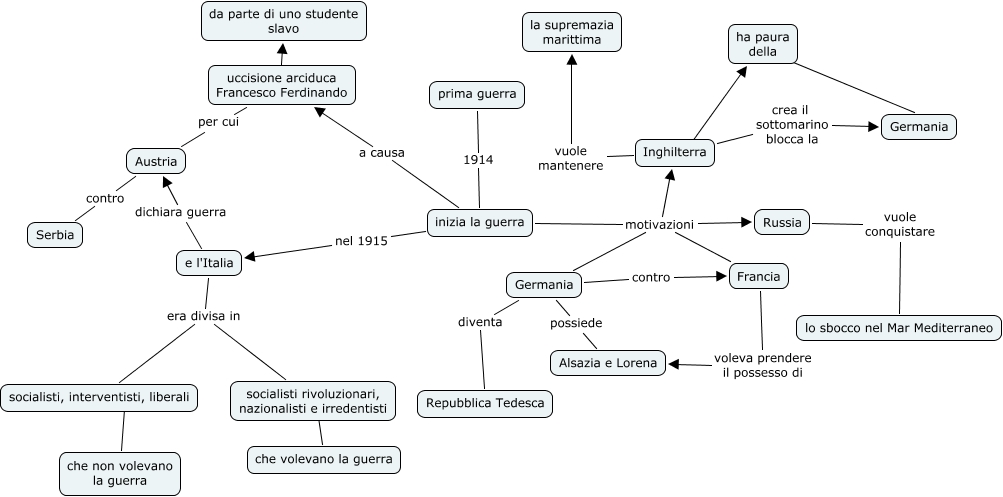 Questa Cmap, creata con IHMC CmapTools, contiene informazioni relative a: prima guerra di giulio, ha paura della ???? Germania, inizia la guerra motivazioni Inghilterra, inizia la guerra motivazioni Russia, socialisti, interventisti, liberali ???? che non volevano la guerra, Austria contro Serbia, Inghilterra ???? ha paura della, e l'Italia dichiara guerra Austria, inizia la guerra motivazioni Francia, inizia la guerra a causa uccisione arciduca Francesco Ferdinando, e l'Italia era divisa in socialisti, interventisti, liberali, Germania contro Francia, uccisione arciduca Francesco Ferdinando ???? da parte di uno studente slavo, Germania diventa Repubblica Tedesca, Inghilterra vuole mantenere la supremazia marittima, Germania possiede Alsazia e Lorena, Francia voleva prendere il possesso di Alsazia e Lorena, Russia vuole conquistare lo sbocco nel Mar Mediterraneo, prima guerra 1914 inizia la guerra, inizia la guerra motivazioni Germania, socialisti rivoluzionari, nazionalisti e irredentisti ???? che volevano la guerra