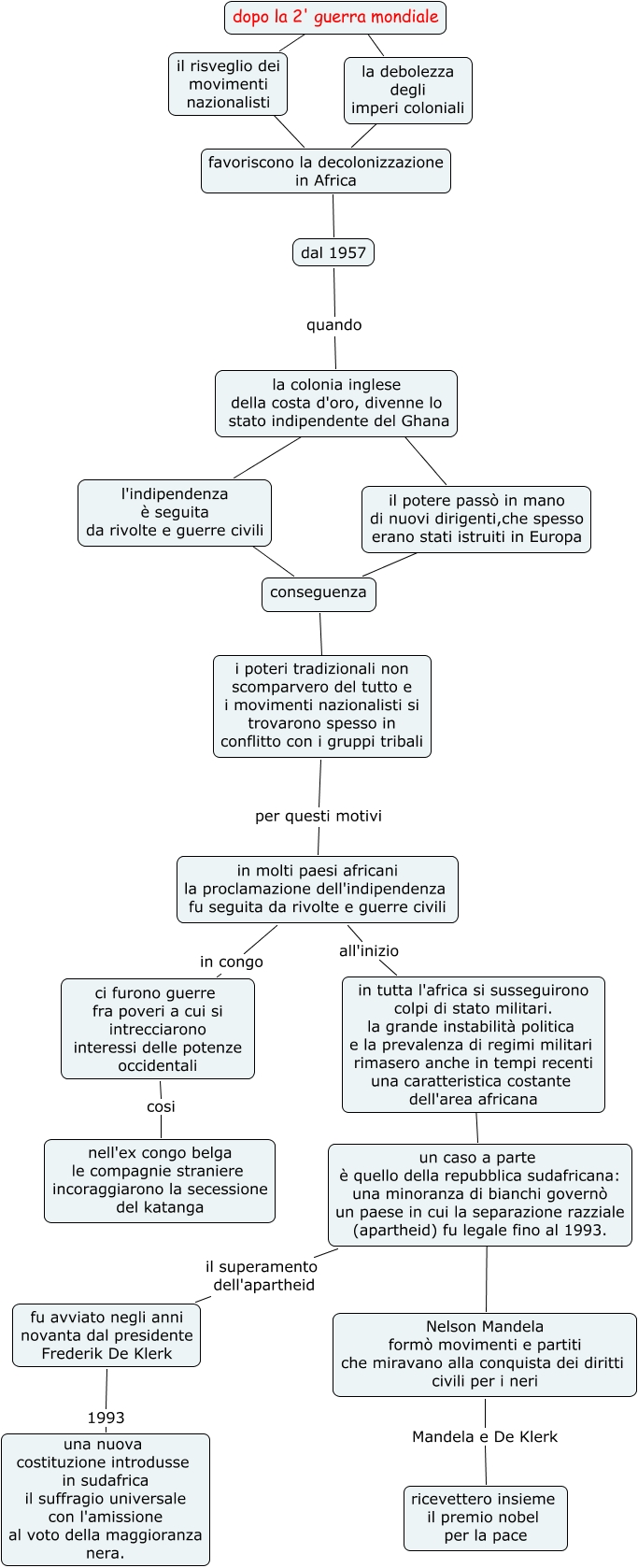 Questa Cmap, creata con IHMC CmapTools, contiene informazioni relative a: mappa esame storia rebecca, in molti paesi africani la proclamazione dell'indipendenza fu seguita da rivolte e guerre civili all'inizio in tutta l'africa si susseguirono colpi di stato militari. la grande instabilità politica e la prevalenza di regimi militari rimasero anche in tempi recenti una caratteristica costante dell'area africana, il potere passò in mano di nuovi dirigenti,che spesso erano stati istruiti in Europa ???? conseguenza, ci furono guerre fra poveri a cui si intrecciarono interessi delle potenze occidentali cosi nell'ex congo belga le compagnie straniere incoraggiarono la secessione del katanga, il risveglio dei movimenti nazionalisti ???? favoriscono la decolonizzazione in Africa, un caso a parte è quello della repubblica sudafricana: una minoranza di bianchi governò un paese in cui la separazione razziale (apartheid) fu legale fino al 1993. ???? Nelson Mandela formò movimenti e partiti che miravano alla conquista dei diritti civili per i neri, la debolezza degli imperi coloniali ???? favoriscono la decolonizzazione in Africa, i poteri tradizionali non scomparvero del tutto e i movimenti nazionalisti si trovarono spesso in conflitto con i gruppi tribali per questi motivi in molti paesi africani la proclamazione dell'indipendenza fu seguita da rivolte e guerre civili, dopo la 2' guerra mondiale ???? la debolezza degli imperi coloniali, dopo la 2' guerra mondiale ???? il risveglio dei movimenti nazionalisti, in molti paesi africani la proclamazione dell'indipendenza fu seguita da rivolte e guerre civili in congo ci furono guerre fra poveri a cui si intrecciarono interessi delle potenze occidentali, fu avviato negli anni novanta dal presidente Frederik De Klerk 1993 una nuova costituzione introdusse in sudafrica il suffragio universale con l'amissione al voto della maggioranza nera., dal 1957 ???? favoriscono la decolonizzazione in Africa, un caso a parte è quello della repubblica sudafricana: una minoranza di bianchi governò un paese in cui la separazione razziale (apartheid) fu legale fino al 1993. il superamento dell'apartheid fu avviato negli anni novanta dal presidente Frederik De Klerk, la colonia inglese della costa d'oro, divenne lo stato indipendente del Ghana ???? il potere passò in mano di nuovi dirigenti,che spesso erano stati istruiti in Europa, in tutta l'africa si susseguirono colpi di stato militari. la grande instabilità politica e la prevalenza di regimi militari rimasero anche in tempi recenti una caratteristica costante dell'area africana ???? un caso a parte è quello della repubblica sudafricana: una minoranza di bianchi governò un paese in cui la separazione razziale (apartheid) fu legale fino al 1993., l'indipendenza è seguita da rivolte e guerre civili ???? conseguenza, conseguenza ???? i poteri tradizionali non scomparvero del tutto e i movimenti nazionalisti si trovarono spesso in conflitto con i gruppi tribali, la colonia inglese della costa d'oro, divenne lo stato indipendente del Ghana ???? l'indipendenza è seguita da rivolte e guerre civili, Nelson Mandela formò movimenti e partiti che miravano alla conquista dei diritti civili per i neri Mandela e De Klerk ricevettero insieme il premio nobel per la pace, dal 1957 quando la colonia inglese della costa d'oro, divenne lo stato indipendente del Ghana