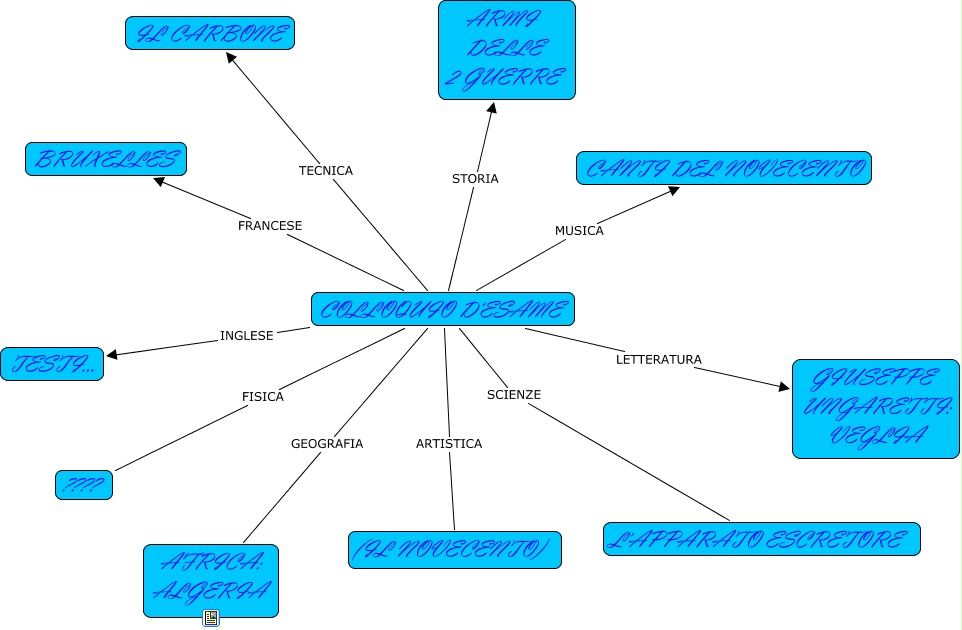 Questa Cmap, creata con IHMC CmapTools, contiene informazioni relative a: MAPPA ESAME VASAPOLLO ALESSANDRO, COLLOQUIO D'ESAME FRANCESE BRUXELLES, COLLOQUIO D'ESAME MUSICA CANTI DEL NOVECENTO, COLLOQUIO D'ESAME TECNICA IL CARBONE, COLLOQUIO D'ESAME INGLESE TESTI..., COLLOQUIO D'ESAME LETTERATURA GIUSEPPE UNGARETTI: VEGLIA, COLLOQUIO D'ESAME GEOGRAFIA AFRICA: ALGERIA, COLLOQUIO D'ESAME STORIA ARMI DELLE 2 GUERRE, COLLOQUIO D'ESAME SCIENZE L'APPARATO ESCRETORE, COLLOQUIO D'ESAME FISICA ????, COLLOQUIO D'ESAME ARTISTICA (IL NOVECENTO)