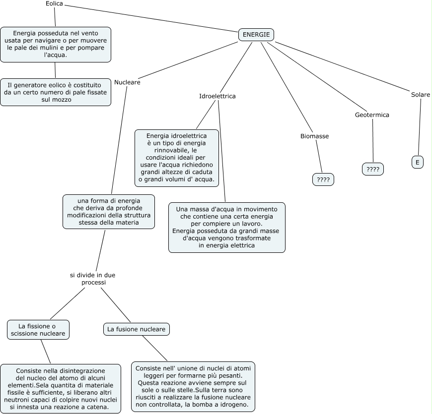 Questa Cmap, creata con IHMC CmapTools, contiene informazioni relative a: mappa energi michal, La fusione nucleare ???? Consiste nell' unione di nuclei di atomi leggeri per formarne più pesanti. Questa reazione avviene sempre sul sole o sulle stelle.Sulla terra sono riusciti a realizzare la fusione nucleare non controllata, la bomba a idrogeno., ENERGIE Geotermica ????, ENERGIE Solare E, ENERGIE Nucleare una forma di energia che deriva da profonde modificazioni della struttura stessa della materia, La fissione o scissione nucleare ???? Consiste nella disintegrazione del nucleo del atomo di alcuni elementi.Sela quantita di materiale fissile è sufficiente, si liberano altri neutroni capaci di colpire nuovi nuclei si innesta una reazione a catena., ENERGIE Idroelettrica Energia idroelettrica è un tipo di energia rinnovabile, le condizioni ideali per usare l'acqua richiedono grandi altezze di caduta o grandi volumi d' acqua., una forma di energia che deriva da profonde modificazioni della struttura stessa della materia si divide in due processi La fissione o scissione nucleare, ENERGIE Biomasse ????, ENERGIE Eolica Energia posseduta nel vento usata per navigare o per muovere le pale dei mulini e per pompare l'acqua., una forma di energia che deriva da profonde modificazioni della struttura stessa della materia si divide in due processi La fusione nucleare, ENERGIE Idroelettrica Una massa d'acqua in movimento che contiene una certa energia per compiere un lavoro. Energia posseduta da grandi masse d'acqua vengono trasformate in energia elettrica, Energia posseduta nel vento usata per navigare o per muovere le pale dei mulini e per pompare l'acqua. ???? Il generatore eolico è costituito da un certo numero di pale fissate sul mozzo