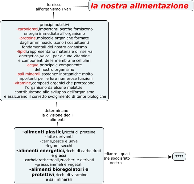 Questa Cmap, creata con IHMC CmapTools, contiene informazioni relative a: mappa esame scienze rebecca, la nostra alimentazione fornisce all'organismo i vari principi nutritivi -carboidrati,importanti perchè forniscono energia immediata all'organismo -proteine,molecole organiche formate dagli amminoacidi,sono i costuituenti fondamentali del nostro organismo -lipidi,rappresentano materiale di riserva energetica,veicoli per alcune vitamine e componenti delle membrane cellulari -acqua,principale componente del nostro organismo -sali minerali,sostanze inorganiche molto importanti per le loro numerose funzioni -vitamine,composti organici che prottegono l'organismo da alcune malattie, contribuiscono allo sviluppo dell'organismo e assicurano il corretto svolgimento di tante biologiche, principi nutritivi -carboidrati,importanti perchè forniscono energia immediata all'organismo -proteine,molecole organiche formate dagli amminoacidi,sono i costuituenti fondamentali del nostro organismo -lipidi,rappresentano materiale di riserva energetica,veicoli per alcune vitamine e componenti delle membrane cellulari -acqua,principale componente del nostro organismo -sali minerali,sostanze inorganiche molto importanti per le loro numerose funzioni -vitamine,composti organici che prottegono l'organismo da alcune malattie, contribuiscono allo sviluppo dell'organismo e assicurano il corretto svolgimento di tante biologiche determinano la divisione degli alimenti -alimenti plastici,ricchi di proteine -latte derivanti -carne,pesce e uova -legumi secchi -alimenti energetici,ricchi di carboidrati e grassi -carboidrati:cereali,zuccheri e derivati -grassi:animali e vegetali -alimenti bioregolatori e protettivi,ricchi di vitamine e sali minerali, -alimenti plastici,ricchi di proteine -latte derivanti -carne,pesce e uova -legumi secchi -alimenti energetici,ricchi di carboidrati e grassi -carboidrati:cereali,zuccheri e derivati -grassi:animali e vegetali -alimenti bioregolatori e protettivi,ricchi di vitamine e sali minerali mediante i quali viene soddisfato il nostro ????