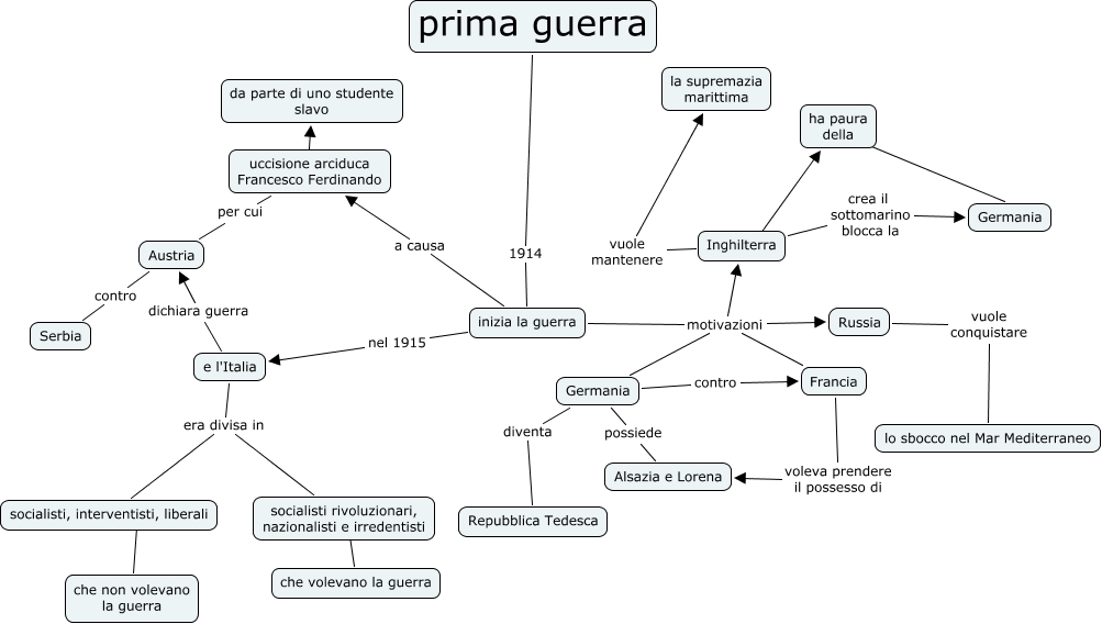 Questa Cmap, creata con IHMC CmapTools, contiene informazioni relative a: prima guerra mondiale di Fabio, ha paura della ???? Germania, inizia la guerra motivazioni Inghilterra, inizia la guerra motivazioni Russia, socialisti, interventisti, liberali ???? che non volevano la guerra, Austria contro Serbia, Inghilterra ???? ha paura della, e l'Italia dichiara guerra Austria, inizia la guerra motivazioni Francia, inizia la guerra a causa uccisione arciduca Francesco Ferdinando, e l'Italia era divisa in socialisti, interventisti, liberali, Germania contro Francia, uccisione arciduca Francesco Ferdinando ???? da parte di uno studente slavo, Germania diventa Repubblica Tedesca, Inghilterra vuole mantenere la supremazia marittima, Germania possiede Alsazia e Lorena, Francia voleva prendere il possesso di Alsazia e Lorena, Russia vuole conquistare lo sbocco nel Mar Mediterraneo, prima guerra 1914 inizia la guerra, inizia la guerra motivazioni Germania, socialisti rivoluzionari, nazionalisti e irredentisti ???? che volevano la guerra