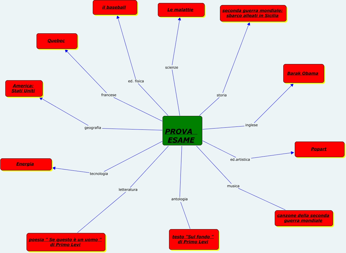 Questa Cmap, creata con IHMC CmapTools, contiene informazioni relative a: prova d' esame - claudio casale, PROVA ESAME letteratura poesia " Se questo è un uomo " di Primo Levi, PROVA ESAME inglese Barak Obama, PROVA ESAME ed. fisica il baseball, PROVA ESAME scienze Le malattie, PROVA ESAME storia seconda guerra mondiale: sbarco alleati in Sicilia, PROVA ESAME antologia testo "Sul fondo " di Primo Levi, PROVA ESAME francese Quebec, PROVA ESAME geografia America: Stati Uniti, PROVA ESAME musica canzone della seconda guerra mondiale, PROVA ESAME ed.artistica Popart, PROVA ESAME tecnologia Energia