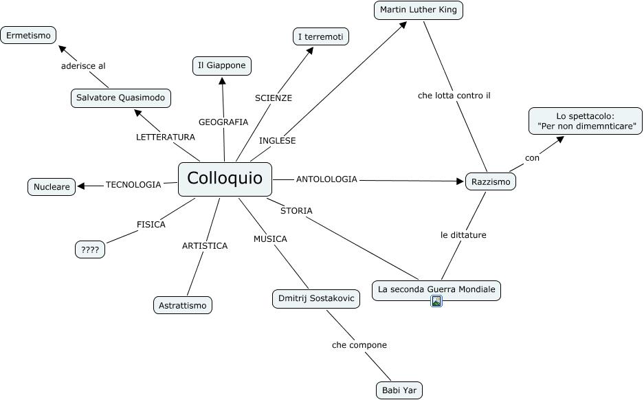 Questa Cmap, creata con IHMC CmapTools, contiene informazioni relative a: Mappa_Esame Finale_Sassi Ester, Dmitrij Sostakovic che compone Babi Yar, Colloquio TECNOLOGIA Nucleare, Colloquio FISICA ????, Martin Luther King che lotta contro il Razzismo, Colloquio INGLESE Martin Luther King, Razzismo le dittature La seconda Guerra Mondiale, Salvatore Quasimodo aderisce al Ermetismo, Razzismo con Lo spettacolo: "Per non dimemnticare", Colloquio ARTISTICA Astrattismo, Colloquio GEOGRAFIA Il Giappone, Colloquio LETTERATURA Salvatore Quasimodo, Colloquio MUSICA Dmitrij Sostakovic, Colloquio STORIA La seconda Guerra Mondiale, Colloquio ANTOLOLOGIA Razzismo, Colloquio SCIENZE I terremoti