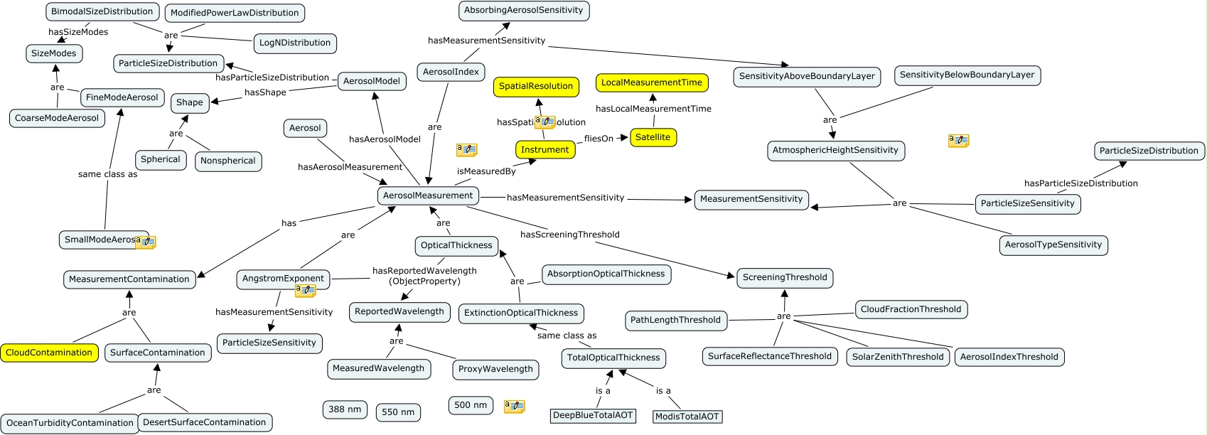 This Concept Map, created with IHMC CmapTools, has information related to: MDSA_UseCase1_Parameters_v2, ModisTotalAOT is a TotalOpticalThickness, OpticalThickness hasReportedWavelength (ObjectProperty) ReportedWavelength, SurfaceContamination are MeasurementContamination, MeasuredWavelength are ReportedWavelength, AerosolMeasurement isMeasuredBy Instrument, PathLengthThreshold are ScreeningThreshold, ModifiedPowerLawDistribution are ParticleSizeDistribution, ParticleSizeSensitivity are MeasurementSensitivity, AerosolIndex hasMeasurementSensitivity AbsorbingAerosolSensitivity, AngstromExponent hasMeasurementSensitivity ParticleSizeSensitivity, BimodalSizeDistribution hasSizeModes SizeModes, Spherical are Shape, Aerosol hasAerosolMeasurement AerosolMeasurement, FineModeAerosol are SizeModes, AngstromExponent hasReportedWavelength (ObjectProperty) ReportedWavelength, SmallModeAerosol same class as FineModeAerosol, OpticalThickness are AerosolMeasurement, CloudFractionThreshold are ScreeningThreshold, Satellite hasLocalMeasurementTime LocalMeasurementTime, DesertSurfaceContamination are SurfaceContamination