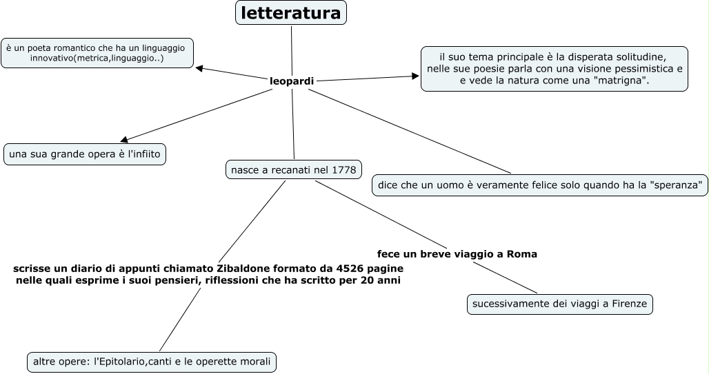 Questa Cmap, creata con IHMC CmapTools, contiene informazioni relative a: ESAME LETTERATURA DENISE, letteratura leopardi è un poeta romantico che ha un linguaggio innovativo(metrica,linguaggio..), nasce a recanati nel 1778 scrisse un diario di appunti chiamato Zibaldone formato da 4526 pagine nelle quali esprime i suoi pensieri, riflessioni che ha scritto per 20 anni altre opere: l'Epitolario,canti e le operette morali, letteratura leopardi una sua grande opera è l'infiito, letteratura leopardi il suo tema principale è la disperata solitudine, nelle sue poesie parla con una visione pessimistica e e vede la natura come una "matrigna"., letteratura leopardi nasce a recanati nel 1778, letteratura leopardi dice che un uomo è veramente felice solo quando ha la "speranza", nasce a recanati nel 1778 fece un breve viaggio a Roma sucessivamente dei viaggi a Firenze
