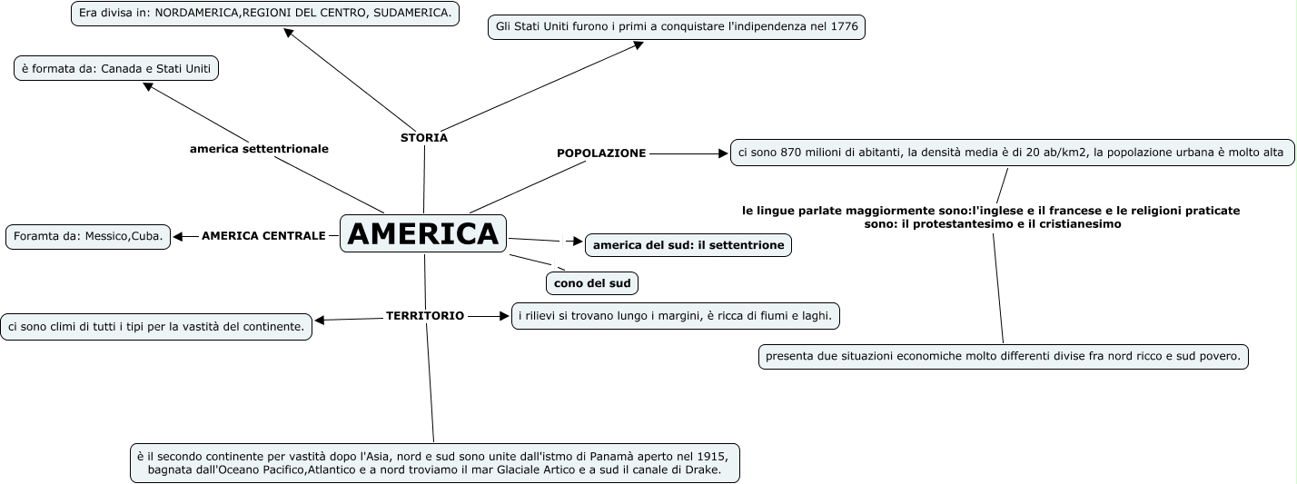 Questa Cmap, creata con IHMC CmapTools, contiene informazioni relative a: ESAME GEOGRAFIA DENISE, AMERICA AMERICA CENTRALE Foramta da: Messico,Cuba., AMERICA TERRITORIO ci sono climi di tutti i tipi per la vastità del continente., AMERICA STORIA Gli Stati Uniti furono i primi a conquistare l'indipendenza nel 1776, ci sono 870 milioni di abitanti, la densità media è di 20 ab/km2, la popolazione urbana è molto alta le lingue parlate maggiormente sono:l'inglese e il francese e le religioni praticate sono: il protestantesimo e il cristianesimo presenta due situazioni economiche molto differenti divise fra nord ricco e sud povero., AMERICA america settentrionale è formata da: Canada e Stati Uniti, AMERICA TERRITORIO i rilievi si trovano lungo i margini, è ricca di fiumi e laghi., AMERICA TERRITORIO è il secondo continente per vastità dopo l'Asia, nord e sud sono unite dall'istmo di Panamà aperto nel 1915, bagnata dall'Oceano Pacifico,Atlantico e a nord troviamo il mar Glaciale Artico e a sud il canale di Drake., AMERICA STORIA Era divisa in: NORDAMERICA,REGIONI DEL CENTRO, SUDAMERICA., AMERICA cono del sud, AMERICA america del sud: il settentrione, AMERICA POPOLAZIONE ci sono 870 milioni di abitanti, la densità media è di 20 ab/km2, la popolazione urbana è molto alta