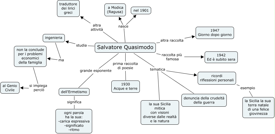 Questa Cmap, creata con IHMC CmapTools, contiene informazioni relative a: Mappa letteratura Claudia, Salvatore Quasimodo tematica la sua Sicilia mitica con visioni diverse dalle realtà e la natura, Salvatore Quasimodo tematica ricordi riflessioni personali, Salvatore Quasimodo tematica denuncia della crudeltà della guerra, non la conclude per i problemi economici della famiglia si impiega perciò al Genio Civile, Salvatore Quasimodo prima raccolta di poesie 1930 Acque e terre, Salvatore Quasimodo grande esponente dell'Ermetismo, dell'Ermetismo significa ogni parola ha la sua: -carica espressiva -significato -ritmo, Salvatore Quasimodo altra raccolta 1947 Giorno dopo giorno, Salvatore Quasimodo nasce nel 1901, Salvatore Quasimodo nasce a Modica (Ragusa), Salvatore Quasimodo altra attività traduttore dei lirici greci, Salvatore Quasimodo raccolta più famosa 1942 Ed è subito sera, ricordi riflessioni personali esempio la Sicilia la sua terra natale di una felice giovinezza, ingenieria ma non la conclude per i problemi economici della famiglia, Salvatore Quasimodo studia ingenieria