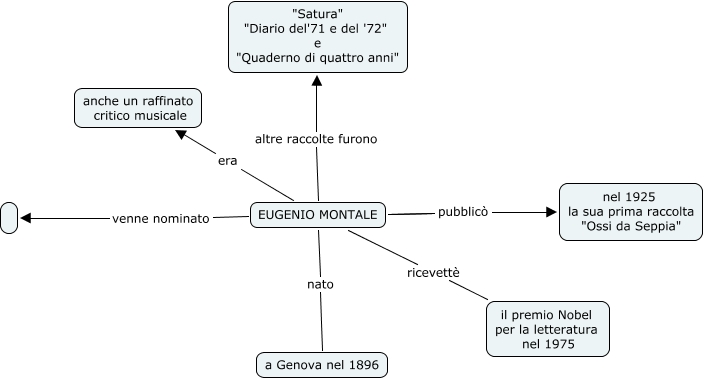Questa Cmap, creata con IHMC CmapTools, contiene informazioni relative a: mappa esame letteratura ana, EUGENIO MONTALE ricevettè il premio Nobel per la letteratura nel 1975, EUGENIO MONTALE pubblicò nel 1925 la sua prima raccolta "Ossi da Seppia", EUGENIO MONTALE altre raccolte furono "Satura" "Diario del'71 e del '72" e "Quaderno di quattro anni", EUGENIO MONTALE era anche un raffinato critico musicale, EUGENIO MONTALE nato a Genova nel 1896, EUGENIO MONTALE venne nominato, EUGENIO MONTALE pubblicò nel 1925 la sua prima raccolta "Ossi da Seppia"