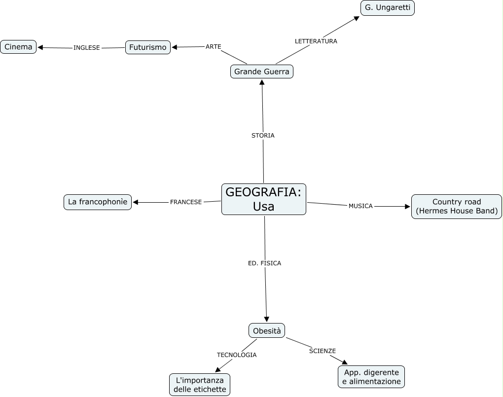 Questa Cmap, creata con IHMC CmapTools, contiene informazioni relative a: MAPPA ESAME SHARON, Grande Guerra LETTERATURA G. Ungaretti, GEOGRAFIA: Usa ED. FISICA Obesità, GEOGRAFIA: Usa MUSICA Country road (Hermes House Band), GEOGRAFIA: Usa STORIA Grande Guerra, GEOGRAFIA: Usa FRANCESE La francophonìe, Obesità SCIENZE App. digerente e alimentazione, Futurismo INGLESE Cinema, Grande Guerra ARTE Futurismo, Obesità TECNOLOGIA L'importanza delle etichette