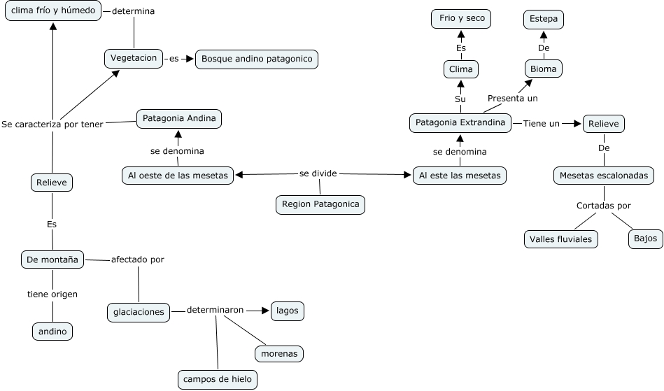 Este mapa conceptual tiene información relacionada a: Kevin Polak, Region Patagonica se divide Al oeste de las mesetas, clima frío y húmedo determina Vegetacion, Patagonia Extrandina Tiene un Relieve, Mesetas escalonadas Cortadas por Bajos, Patagonia Extrandina Presenta un Bioma, Clima Es Frio y seco, Bioma De Estepa, Relieve De Mesetas escalonadas, Patagonia Andina Se caracteriza por tener clima frío y húmedo, Vegetacion es Bosque andino patagonico