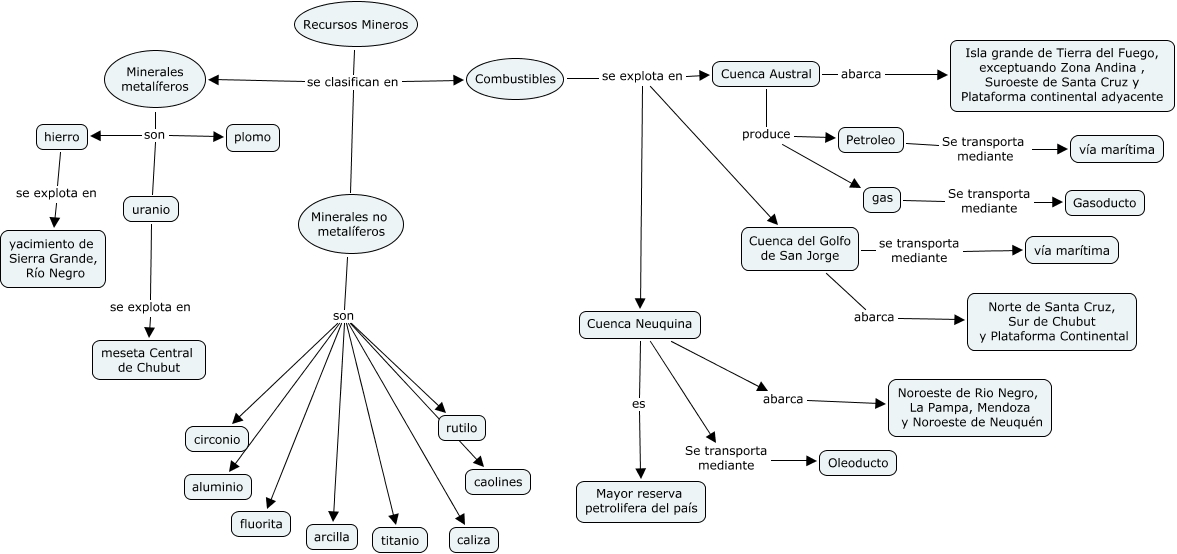Este Cmap, tiene información relacionada con: recursos mineros 4°1ra micaela y karina, Cuenca del Golfo de San Jorge se transporta mediante vía marítima, uranio se explota en meseta Central de Chubut, Minerales metalíferos son uranio, Cuenca del Golfo de San Jorge abarca Norte de Santa Cruz, Sur de Chubut y Plataforma Continental, Minerales no metalíferos son circonio, Minerales no metalíferos son rutilo, Cuenca Austral produce gas, Minerales metalíferos son hierro, Minerales no metalíferos son caliza, Minerales no metalíferos son aluminio, Minerales no metalíferos son arcilla, Minerales no metalíferos son titanio, Minerales no metalíferos son fluorita, Combustibles se explota en Cuenca Austral, Cuenca Austral abarca Isla grande de Tierra del Fuego, exceptuando Zona Andina , Suroeste de Santa Cruz y Plataforma continental adyacente, Cuenca Neuquina es Mayor reserva petrolifera del país, Combustibles se explota en Cuenca del Golfo de San Jorge, Minerales metalíferos son plomo, Recursos Mineros se clasifican en Minerales metalíferos, Cuenca Neuquina abarca Noroeste de Rio Negro, La Pampa, Mendoza y Noroeste de Neuquén