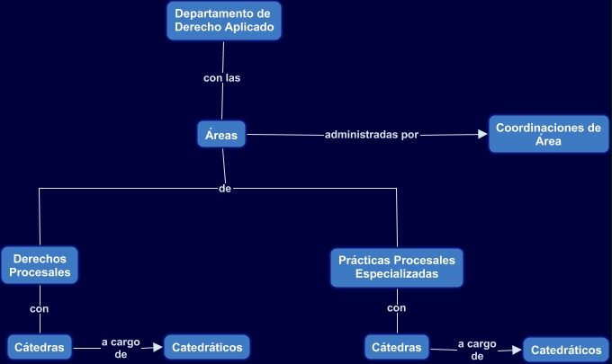 Este Cmap, tiene información relacionada con: Departamento de Derecho Aplicado, Áreas de Prácticas Procesales Especializadas, Áreas administradas por Coordinaciones de Área, Prácticas Procesales Especializadas con Cátedras, Áreas de Derechos Procesales, Departamento de Derecho Aplicado con las Áreas, Cátedras a cargo de Catedráticos, Derechos Procesales con Cátedras, Cátedras a cargo de Catedráticos