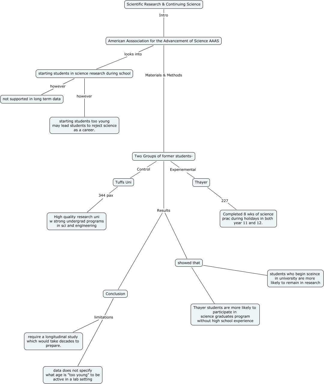 This Concept Map, created with IHMC CmapTools, has information related to: Research V Staying in Science, starting students in science research during school however starting students too young may lead students to reject science as a career., American Aossociation for the Advancement of Science AAAS looks into starting students in science research during school, Conclusion limitations require a longitudinal study which would take decades to prepare., Conclusion limitations data does not specify what age is "too young" to be active in a lab setting, Scientific Research & Continuing Science Intro American Aossociation for the Advancement of Science AAAS, Two Groups of former students- Experiemental Thayer, Thayer 227 Completed 8 wks of science prac during holidays in both year 11 and 12., Two Groups of former students- Results Conclusion, American Aossociation for the Advancement of Science AAAS Materials & Methods Two Groups of former students-, Two Groups of former students- Results showed that, starting students in science research during school however not supported in long term data, showed that ???? students who begin sceince in university are more likely to remain in research, Tuffs Uni 344 pax High quality research uni w strong undergrad programs in sci and engineering, showed that ???? Thayer students are more likely to participate in science graduates program without high school experience, Two Groups of former students- Control Tuffs Uni