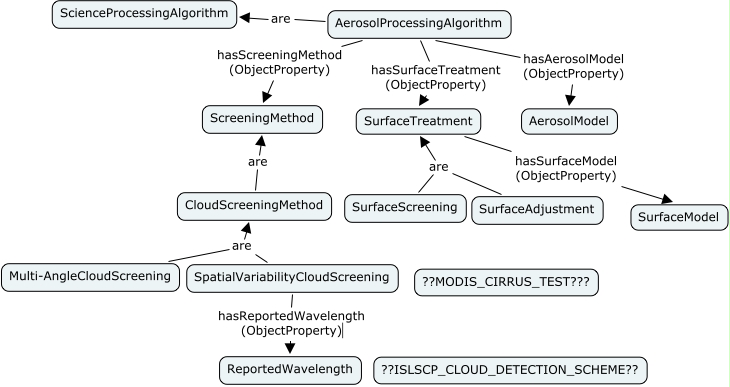 This Concept Map, created with IHMC CmapTools, has information related to: MDSA_Aerosol_Algorithms_v1, AerosolProcessingAlgorithm hasSurfaceTreatment (ObjectProperty) SurfaceTreatment, Multi-AngleCloudScreening are CloudScreeningMethod, SpatialVariabilityCloudScreening hasReportedWavelength (ObjectProperty) ReportedWavelength, SpatialVariabilityCloudScreening are CloudScreeningMethod, CloudScreeningMethod are ScreeningMethod, SurfaceTreatment hasSurfaceModel (ObjectProperty) SurfaceModel, SurfaceScreening are SurfaceTreatment, AerosolProcessingAlgorithm are ScienceProcessingAlgorithm, AerosolProcessingAlgorithm hasAerosolModel (ObjectProperty) AerosolModel, SurfaceAdjustment are SurfaceTreatment, AerosolProcessingAlgorithm hasScreeningMethod (ObjectProperty) ScreeningMethod
