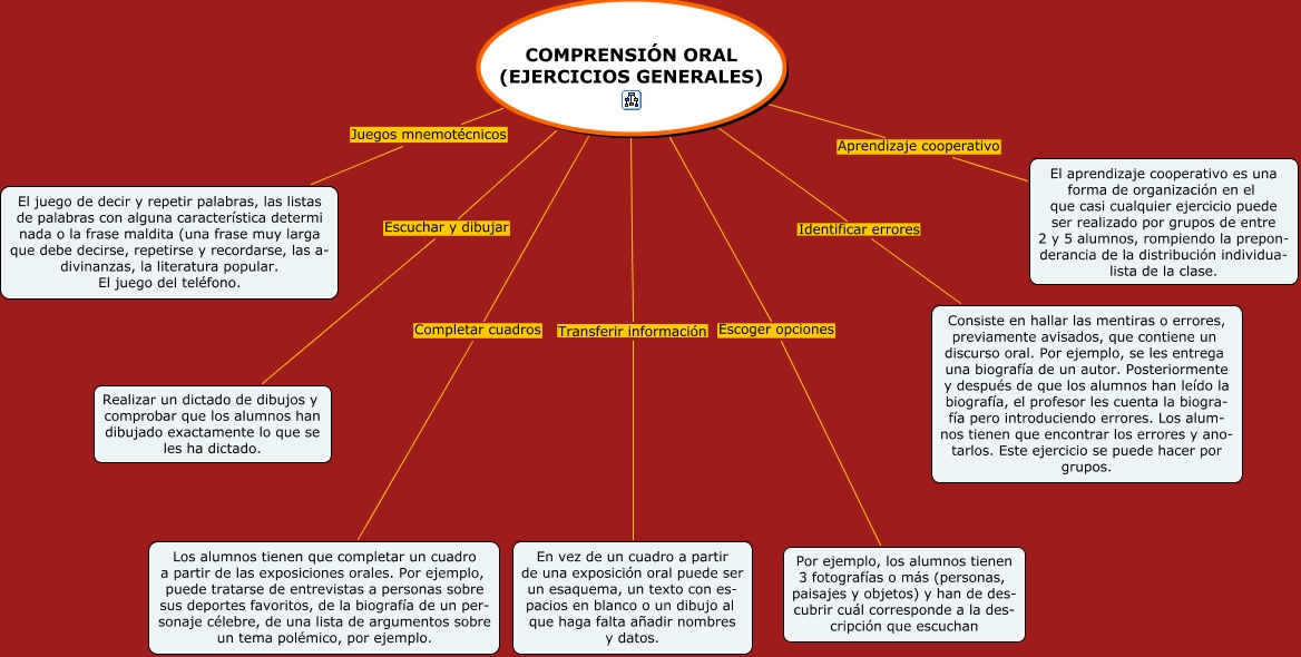 Este Cmap, tiene información relacionada con: Comprensión oral.Ejercicios generales, COMPRENSIÓN ORAL (EJERCICIOS GENERALES) Transferir información En vez de un cuadro a partir de una exposición oral puede ser un esaquema, un texto con es- pacios en blanco o un dibujo al que haga falta añadir nombres y datos., COMPRENSIÓN ORAL (EJERCICIOS GENERALES) Aprendizaje cooperativo El aprendizaje cooperativo es una forma de organización en el que casi cualquier ejercicio puede ser realizado por grupos de entre 2 y 5 alumnos, rompiendo la prepon- derancia de la distribución individua- lista de la clase., COMPRENSIÓN ORAL (EJERCICIOS GENERALES) Completar cuadros Los alumnos tienen que completar un cuadro a partir de las exposiciones orales. Por ejemplo, puede tratarse de entrevistas a personas sobre sus deportes favoritos, de la biografía de un per- sonaje célebre, de una lista de argumentos sobre un tema polémico, por ejemplo., COMPRENSIÓN ORAL (EJERCICIOS GENERALES) Escoger opciones Por ejemplo, los alumnos tienen 3 fotografías o más (personas, paisajes y objetos) y han de des- cubrir cuál corresponde a la des- cripción que escuchan, COMPRENSIÓN ORAL (EJERCICIOS GENERALES) Identificar errores Consiste en hallar las mentiras o errores, previamente avisados, que contiene un discurso oral. Por ejemplo, se les entrega una biografía de un autor. Posteriormente y después de que los alumnos han leído la biografía, el profesor les cuenta la biogra- fía pero introduciendo errores. Los alum- nos tienen que encontrar los errores y ano- tarlos. Este ejercicio se puede hacer por grupos., COMPRENSIÓN ORAL (EJERCICIOS GENERALES) Escuchar y dibujar Realizar un dictado de dibujos y comprobar que los alumnos han dibujado exactamente lo que se les ha dictado., COMPRENSIÓN ORAL (EJERCICIOS GENERALES) Juegos mnemotécnicos El juego de decir y repetir palabras, las listas de palabras con alguna característica determi nada o la frase maldita (una frase muy larga que debe decirse, repetirse y recordarse, las a- divinanzas, la literatura popular. El juego del teléfono.