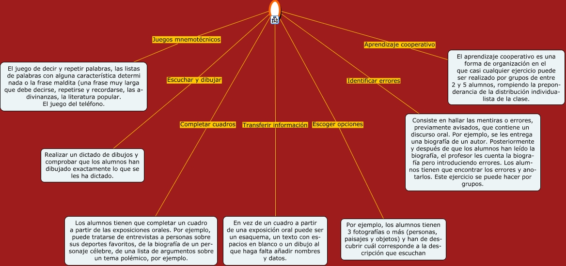 Este Cmap, tiene información relacionada con: Comprensión oral.Ejercicios generales, Completar cuadros Los alumnos tienen que completar un cuadro a partir de las exposiciones orales. Por ejemplo, puede tratarse de entrevistas a personas sobre sus deportes favoritos, de la biografía de un per- sonaje célebre, de una lista de argumentos sobre un tema polémico, por ejemplo., Aprendizaje cooperativo El aprendizaje cooperativo es una forma de organización en el que casi cualquier ejercicio puede ser realizado por grupos de entre 2 y 5 alumnos, rompiendo la prepon- derancia de la distribución individua- lista de la clase., Transferir información En vez de un cuadro a partir de una exposición oral puede ser un esaquema, un texto con es- pacios en blanco o un dibujo al que haga falta añadir nombres y datos., Escoger opciones Por ejemplo, los alumnos tienen 3 fotografías o más (personas, paisajes y objetos) y han de des- cubrir cuál corresponde a la des- cripción que escuchan, Juegos mnemotécnicos El juego de decir y repetir palabras, las listas de palabras con alguna característica determi nada o la frase maldita (una frase muy larga que debe decirse, repetirse y recordarse, las a- divinanzas, la literatura popular. El juego del teléfono., Escuchar y dibujar Realizar un dictado de dibujos y comprobar que los alumnos han dibujado exactamente lo que se les ha dictado., Identificar errores Consiste en hallar las mentiras o errores, previamente avisados, que contiene un discurso oral. Por ejemplo, se les entrega una biografía de un autor. Posteriormente y después de que los alumnos han leído la biografía, el profesor les cuenta la biogra- fía pero introduciendo errores. Los alum- nos tienen que encontrar los errores y ano- tarlos. Este ejercicio se puede hacer por grupos.