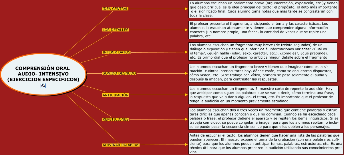 Este Cmap, tiene información relacionada con: Comprensión oral. Ejercicios intensivos, COMPRENSIÓN ORAL AUDIO- INTENSIVO (EJERCICIOS ESPECÍFICOS) IDEA CENTRAL Lo alumnos escuchan un parlamento breve (argumentación, exposición, etc.)y tienen que descubrir cuál es la idea principal del texto: el propósito, el dato más importante o el significado final. Cada alumno toma notas que más tarde se contrastarán con toda la clase., COMPRENSIÓN ORAL AUDIO- INTENSIVO (EJERCICIOS ESPECÍFICOS) SONIDO DESNUDO Los alumnos escuchan un fragmento breve y tienen que imaginar cómo es la si- tuación: cuántos interlocutores hay, dónde están, cómo se encuentran dispuestos, cómo visten, etc. Si se trabaja con vídeo, primero se pasa solamente el audio y después la imagen, para contrastar las respuestas., COMPRENSIÓN ORAL AUDIO- INTENSIVO (EJERCICIOS ESPECÍFICOS) ANTICIPACIÓN Los alumnos escuchan un fragmento. El maestro corta de repente la audición. Hay que anticipar como sigue: las palabras que se van a decir, cómo termina una frase, la respuesta que va a dar a alguien, el tema, etc. Es importante que el profesor de- tenga la audición en un momento previamente estudiado, COMPRENSIÓN ORAL AUDIO- INTENSIVO (EJERCICIOS ESPECÍFICOS) REPETICIONES Loa alumnos escuchan dos o tres veces un fragmento que contiene palabras o estruc- turas difíciles que apenas conocen o que no dominan. Cuando se ha escuchado cada palabra o frase, el profesor detiene el aparato y se repiten los items lingüísticos. Si se trabaja con vídeo, se puede congelar la imagen para que los alumnos repitan, o inclu- so se puede pasar la secuencia sin sonido para que ellos doblen a los personajes., COMPRENSIÓN ORAL AUDIO- INTENSIVO (EJERCICIOS ESPECÍFICOS) INFERIR DATOS Los alumnos escuchan un fragmento muy breve (de treinta segundos) de un diálogo o exposición y tienen que inferir de él informaciones variadas: ¿Cuál es el tema?, ¿quién habla (edad, sexo, carácter, etc.), ¿cómo es?, ¿qué pretende?, etc. Es primordial que el profesor no anticipe ningún detalle sobre el fragmento, COMPRENSIÓN ORAL AUDIO- INTENSIVO (EJERCICIOS ESPECÍFICOS) LOS DETALLES El profesor presenta el fragmento, anticipando el tema y las caracteristicas. Los alumnos lo escuchan atentamente y tienen que comprender alguna información concreta (un nombre propio, una fecha, la cantidad de veces que se repite una palabra, etc., COMPRENSIÓN ORAL AUDIO- INTENSIVO (EJERCICIOS ESPECÍFICOS) ADIVINAR PALABRAS Antes de escuchar el texto, los alumnos tienen que hacer una lista de las palabras que pueden aparecer. El maestro expone el tema de la grabación (con una palabra es sufi- ciente) para que los alumnos puedan anticipar temas, palabras, estructuras, etc. Es una técnica útil para que los alumnos preparen la audición utilizando sus conocimientos pre- vios.