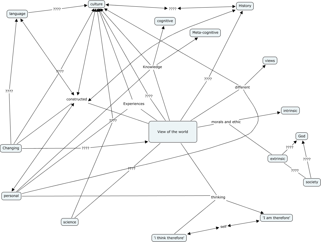 This Concept Map, created with IHMC CmapTools, has information related to: view of the world, personal different culture, extrinsic ???? society, personal thinking 'I am therefore', personal thinking 'i think therefore', View of the world morals and ethic extrinsic, personal Knowledge cognitive, View of the world constructed culture, Changing ???? View of the world, History constructed language, personal Knowledge culture, Changing ???? culture, View of the world different views, View of the world Experiences personal, View of the world Knowledge culture, History ???? culture, View of the world morals and ethic intrinsic, View of the world different culture, View of the world ???? science, extrinsic ???? God, View of the world constructed language