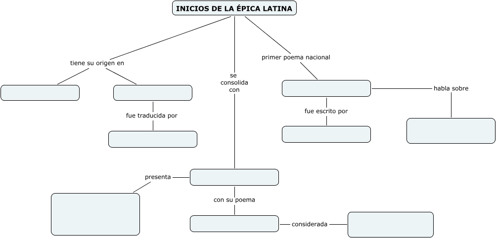 Este mapa conceptual tiene información relacionada a: Inicios épica latina, considerada , presenta , fue escrito por , INICIOS DE LA ÉPICA LATINA se consolida con , habla sobre , fue traducida por , con su poema , INICIOS DE LA ÉPICA LATINA tiene su origen en , INICIOS DE LA ÉPICA LATINA tiene su origen en , INICIOS DE LA ÉPICA LATINA primer poema nacional