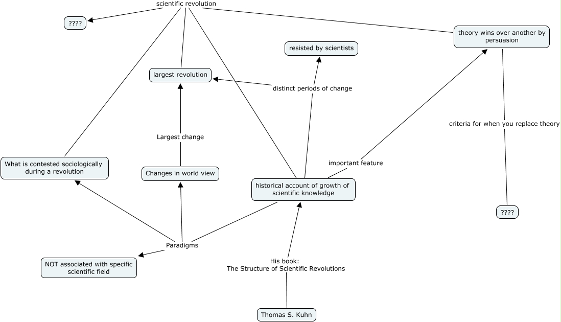 This Concept Map, created with IHMC CmapTools, has information related to: T.S. Kuhn week 7 by Dan, theory wins over another by persuasion criteria for when you replace theory ????, historical account of growth of scientific knowledge scientific revolution ????, largest revolution scientific revolution ????, historical account of growth of scientific knowledge important feature theory wins over another by persuasion, What is contested sociologically during a revolution scientific revolution ????, historical account of growth of scientific knowledge Paradigms NOT associated with specific scientific field, historical account of growth of scientific knowledge Paradigms Changes in world view, historical account of growth of scientific knowledge Paradigms What is contested sociologically during a revolution, Thomas S. Kuhn His book: The Structure of Scientific Revolutions historical account of growth of scientific knowledge, theory wins over another by persuasion scientific revolution ????, historical account of growth of scientific knowledge distinct periods of change resisted by scientists, Changes in world view Largest change largest revolution, historical account of growth of scientific knowledge distinct periods of change largest revolution
