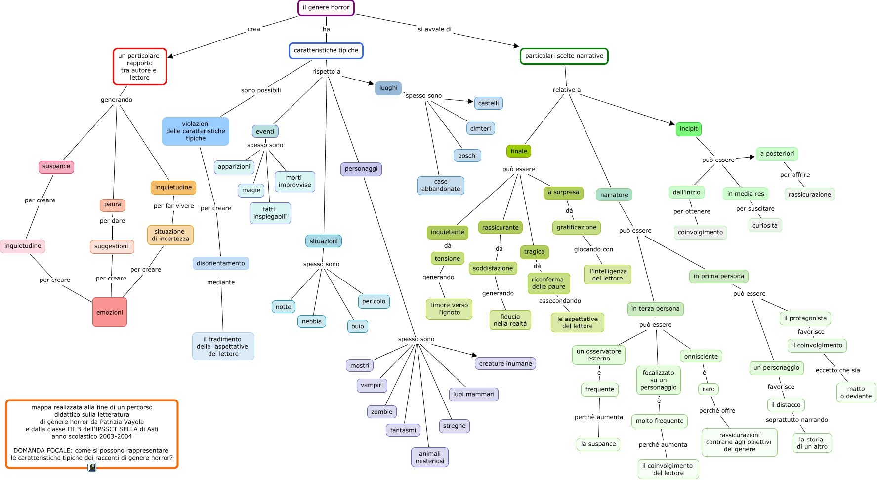 Questa Mappa Concettuale ha informazioni correlate a: Il genere horror_vayola, luoghi spesso sono boschi, personaggi spesso sono animali misteriosi, personaggi spesso sono zombie, in media res per suscitare curiosità, in prima persona può essere il protagonista, in terza persona può essere un osservatore esterno, un osservatore esterno è frequente, personaggi spesso sono streghe, incipit può essere in media res, eventi spesso sono apparizioni