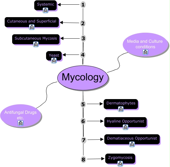 This Concept Map, created with IHMC CmapTools, has information related to: Mycology, Mycology 5 Dermatophytes, Mycology 7 Dematiaceous Opportunist, Mycology 8 Zygomycosis, Mycology ???? Media and Culture conditions, Mycology 2 Cutaneous and Superficial, Mycology 4 Yeast, Mycology 1 Systemic, Mycology ???? Antifungal Drugs etc., Mycology 6 Hyaline Opportunist, Mycology 3 Subcutaneous Mycosis