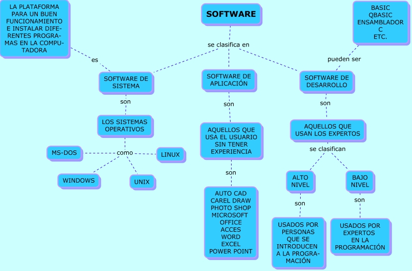 Este Cmap, tiene información relacionada con: SOFTWARE, SOFTWARE se clasifica en SOFTWARE DE APLICACIÓN, AQUELLOS QUE USAN LOS EXPERTOS se clasifican BAJO NIVEL, LOS SISTEMAS OPERATIVOS como MS-DOS, ALTO NIVEL son USADOS POR PERSONAS QUE SE INTRODUCEN A LA PROGRA- MACIÓN, LOS SISTEMAS OPERATIVOS como WINDOWS, LOS SISTEMAS OPERATIVOS como UNIX, AQUELLOS QUE USAN LOS EXPERTOS se clasifican ALTO NIVEL, SOFTWARE se clasifica en SOFTWARE DE DESARROLLO, SOFTWARE DE SISTEMA son LOS SISTEMAS OPERATIVOS, AQUELLOS QUE USA EL USUARIO SIN TENER EXPERIENCIA son AUTO CAD CAREL DRAW PHOTO SHOP MICROSOFT OFFICE ACCES WORD EXCEL POWER POINT, SOFTWARE DE DESARROLLO son AQUELLOS QUE USAN LOS EXPERTOS, BAJO NIVEL son USADOS POR EXPERTOS EN LA PROGRAMACIÓN, SOFTWARE DE SISTEMA es LA PLATAFORMA PARA UN BUEN FUNCIONAMIENTO E INSTALAR DIFE- RENTES PROGRA- MAS EN LA COMPU- TADORA, LOS SISTEMAS OPERATIVOS como LINUX, SOFTWARE se clasifica en SOFTWARE DE SISTEMA, SOFTWARE DE APLICACIÓN son AQUELLOS QUE USA EL USUARIO SIN TENER EXPERIENCIA, SOFTWARE DE DESARROLLO pueden ser BASIC QBASIC ENSAMBLADOR C ETC.