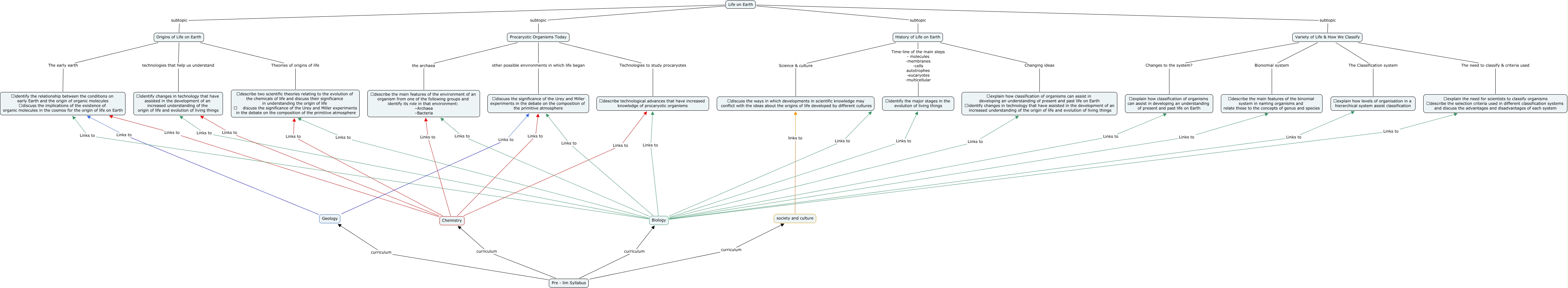 This Concept Map, created with IHMC CmapTools, has information related to: finished one, Life on Earth subtopic History of Life on Earth, Chemistry Links to describe technological advances that have increased knowledge of procaryotic organisms, Chemistry Links to identify changes in technology that have assisted in the development of an increased understanding of the origin of life and evolution of living things, Chemistry Links to identify the relationship between the conditions on early Earth and the origin of organic molecules discuss the implications of the existence of organic molecules in the cosmos for the origin of life on Earth, Life on Earth subtopic Origins of Life on Earth, Variety of Life & How We Classify Bionomial system describe the main features of the binomial system in naming organisms and relate these to the concepts of genus and species, Biology Links to explain how levels of organisation in a hierarchical system assist classification, Biology Links to identify the major stages in the evolution of living things, History of Life on Earth Science & culture discuss the ways in which developments in scientific knowledge may conflict with the ideas about the origins of life developed by different cultures, Life on Earth subtopic Procaryotic Organisms Today, Chemistry Links to describe the main features of the environment of an organism from one of the following groups and identify its role in that environment: – Archaea – Bacteria, Chemistry Links to describe two scientific theories relating to the evolution of the chemicals of life and discuss their significance in understanding the origin of life discuss the significance of the Urey and Miller experiments in the debate on the composition of the primitive atmosphere, Variety of Life & How We Classify The Classification system explain how levels of organisation in a hierarchical system assist classification, Chemistry Links to discuss the significance of the Urey and Miller experiments in the debate on the composition of the primitive atmosphere, Biology Links to identify the relationship between the conditions on early Earth and the origin of organic molecules discuss the implications of the existence of organic molecules in the cosmos for the origin of life on Earth, Procaryotic Organisms Today Technologies to study procaryotes describe technological advances that have increased knowledge of procaryotic organisms, History of Life on Earth Changing ideas explain how classification of organisms can assist in developing an understanding of present and past life on Earth identify changes in technology that have assisted in the development of an increased understanding of the origin of life and evolution of living things, Biology Links to describe technological advances that have increased knowledge of procaryotic organisms, Biology Links to discuss the ways in which developments in scientific knowledge may conflict with the ideas about the origins of life developed by different cultures, Biology Links to identify changes in technology that have assisted in the development of an increased understanding of the origin of life and evolution of living things
