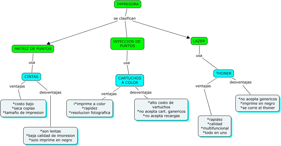 Este Cmap, tiene información relacionada con: Sin Título 3, THONER desventajas *no acepta genericos *imprime en negro *se corre el thoner, INYECCION DE PUNTOS usa CARTUCHOS A COLOR, IMPRESORA se clasifican INYECCION DE PUNTOS, THONER ventajas *rapidez *calidad *multifuncional *todo en uno, CINTAS desventajas *son lentas *baja calidad de imoresion *solo imprime en negro, IMPRESORA se clasifican LAZER, IMPRESORA se clasifican MATRIZ DE PUNTOS, CARTUCHOS A COLOR ventajas i*imprime a color *rapidez *resolucion fotografica, MATRIZ DE PUNTOS usa CINTAS, LAZER usa THONER, CARTUCHOS A COLOR desventajas *alto costo de vartuchos *no acepta cart. ganericos *no acepta recargas, CINTAS ventajas *costo bajo *saca copias *tamaño de impresion