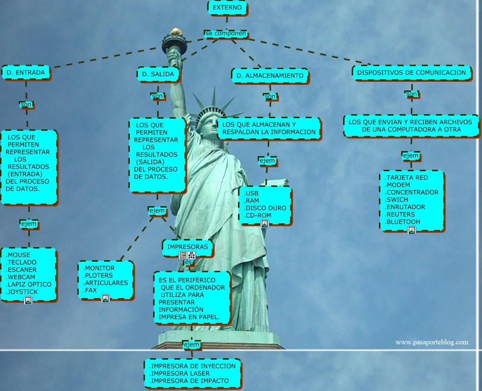 Este Cmap, tiene información relacionada con: EXTERNO, D. ALMACENAMIENTO son LOS QUE ALMACENAN Y RESPALDAN LA INFORMACION, LOS QUE PERMITEN REPRESENTAR LOS RESULTADOS (ENTRADA) DEL PROCESO DE DATOS. ejem .MOUSE .TECLADO .ESCANER .WEBCAM .LAPIZ OPTICO .JOYSTICK, EXTERNO se componen D. ALMACENAMIENTO, LOS QUE ENVIAN Y RECIBEN ARCHIVOS DE UNA COMPUTADORA A OTRA son DISPOSITIVOS DE COMUNICACION, LOS QUE ENVIAN Y RECIBEN ARCHIVOS DE UNA COMPUTADORA A OTRA ejem .TARJETA RED .MODEM .CONCENTRADOR .SWICH .ENRUTADOR .REUTERS .BLUETOOH, LOS QUE PERMITEN REPRESENTAR LOS RESULTADOS (SALIDA) DEL PROCESO DE DATOS. ejem IMPRESORAS, LOS QUE PERMITEN REPRESENTAR LOS RESULTADOS (SALIDA) DEL PROCESO DE DATOS. son D. SALIDA, D. ENTRADA son LOS QUE PERMITEN REPRESENTAR LOS RESULTADOS (ENTRADA) DEL PROCESO DE DATOS., IMPRESORAS es ES EL PERIFÉRICO QUE EL ORDENADOR UTILIZA PARA PRESENTAR INFORMACIÓN IMPRESA EN PAPEL., LOS QUE ALMACENAN Y RESPALDAN LA INFORMACION ejem .USB .RAM .DISCO DURO .CD-ROM, EXTERNO se componen D. SALIDA, ES EL PERIFÉRICO QUE EL ORDENADOR UTILIZA PARA PRESENTAR INFORMACIÓN IMPRESA EN PAPEL. ejem .IMPRESORA DE INYECCION .IMPRESORA LASER .IMPRESORA DE IMPACTO, EXTERNO se componen D. ENTRADA, LOS QUE PERMITEN REPRESENTAR LOS RESULTADOS (SALIDA) DEL PROCESO DE DATOS. ejem .MONITOR .PLOTERS .ARTICULARES .FAX, EXTERNO se componen DISPOSITIVOS DE COMUNICACION