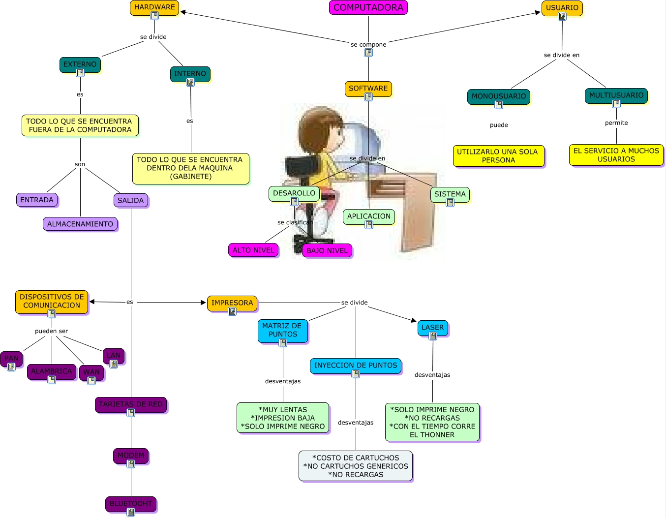 Este Cmap, tiene información relacionada con: MARIEL BAUTISTA LOBATO NL4, SALIDA es MODEM, DISPOSITIVOS DE COMUNICACION pueden ser LAN, SOFTWARE se divide en APLICACION, SALIDA es TARJETAS DE RED, TODO LO QUE SE ENCUENTRA FUERA DE LA COMPUTADORA son ALMACENAMIENTO, SOFTWARE se divide en SISTEMA, DESAROLLO se clasifican ALTO NIVEL, USUARIO se divide en MONOUSUARIO, COMPUTADORA se compone USUARIO, DISPOSITIVOS DE COMUNICACION pueden ser WAN, DESAROLLO se clasifican BAJO NIVEL, TODO LO QUE SE ENCUENTRA FUERA DE LA COMPUTADORA son ENTRADA, DISPOSITIVOS DE COMUNICACION pueden ser ALAMBRICA, LASER desventajas *SOLO IMPRIME NEGRO *NO RECARGAS *CON EL TIEMPO CORRE EL THONNER, DISPOSITIVOS DE COMUNICACION pueden ser PAN, MATRIZ DE PUNTOS desventajas *MUY LENTAS *IMPRESION BAJA *SOLO IMPRIME NEGRO, SALIDA es BLUETOOHT, MULTIUSUARIO permite EL SERVICIO A MUCHOS USUARIOS, TODO LO QUE SE ENCUENTRA FUERA DE LA COMPUTADORA son SALIDA, EXTERNO es TODO LO QUE SE ENCUENTRA FUERA DE LA COMPUTADORA