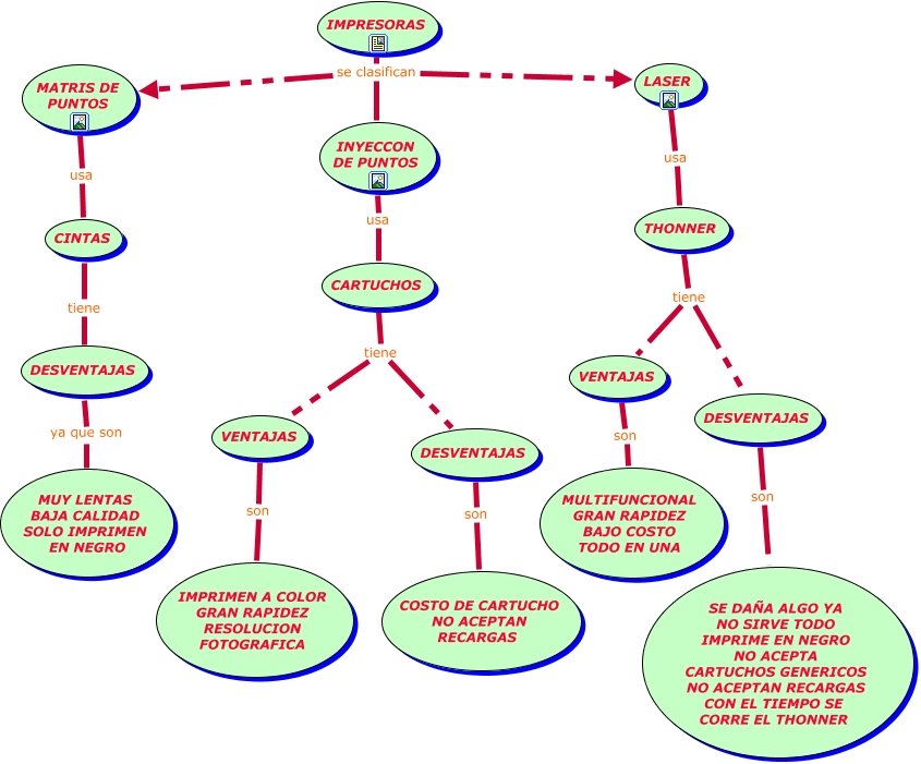 Este Cmap, tiene información relacionada con: impresoras, DESVENTAJAS ya que son MUY LENTAS BAJA CALIDAD SOLO IMPRIMEN EN NEGRO, DESVENTAJAS son COSTO DE CARTUCHO NO ACEPTAN RECARGAS, IMPRESORAS se clasifican LASER, VENTAJAS son IMPRIMEN A COLOR GRAN RAPIDEZ RESOLUCION FOTOGRAFICA, DESVENTAJAS son SE DAÑA ALGO YA NO SIRVE TODO IMPRIME EN NEGRO NO ACEPTA CARTUCHOS GENERICOS NO ACEPTAN RECARGAS CON EL TIEMPO SE CORRE EL THONNER, IMPRESORAS se clasifican MATRIS DE PUNTOS, CARTUCHOS tiene DESVENTAJAS, LASER usa THONNER, CARTUCHOS tiene VENTAJAS, CINTAS tiene DESVENTAJAS, INYECCON DE PUNTOS usa CARTUCHOS, THONNER tiene DESVENTAJAS, IMPRESORAS se clasifican INYECCON DE PUNTOS, THONNER tiene VENTAJAS, MATRIS DE PUNTOS usa CINTAS, VENTAJAS son MULTIFUNCIONAL GRAN RAPIDEZ BAJO COSTO TODO EN UNA