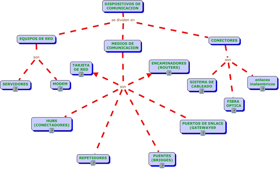 Este Cmap, tiene información relacionada con: dispositivos de comunicacion, CONECTORES son SISTEMA DE CABLEADO, MEDIOS DE COMUNICACION son HUBS (CONECTADORES), DISPOSITIVOS DE COMUNICACION se dividen en MEDIOS DE COMUNICACION, EQUIPOS DE RED son MODEM, EQUIPOS DE RED son SERVIDORES, CONECTORES son enlaces inalambricos, MEDIOS DE COMUNICACION son PUERTOS DE ENLACE (GATEWAYS9, MEDIOS DE COMUNICACION son TARJETA DE RED, DISPOSITIVOS DE COMUNICACION se dividen en CONECTORES, MEDIOS DE COMUNICACION son ENCAMINADORES (ROUTERS), CONECTORES son FIBRA OPTICA, DISPOSITIVOS DE COMUNICACION se dividen en EQUIPOS DE RED, MEDIOS DE COMUNICACION son REPETIDORES, MEDIOS DE COMUNICACION son PUENTES (BRIDGES)