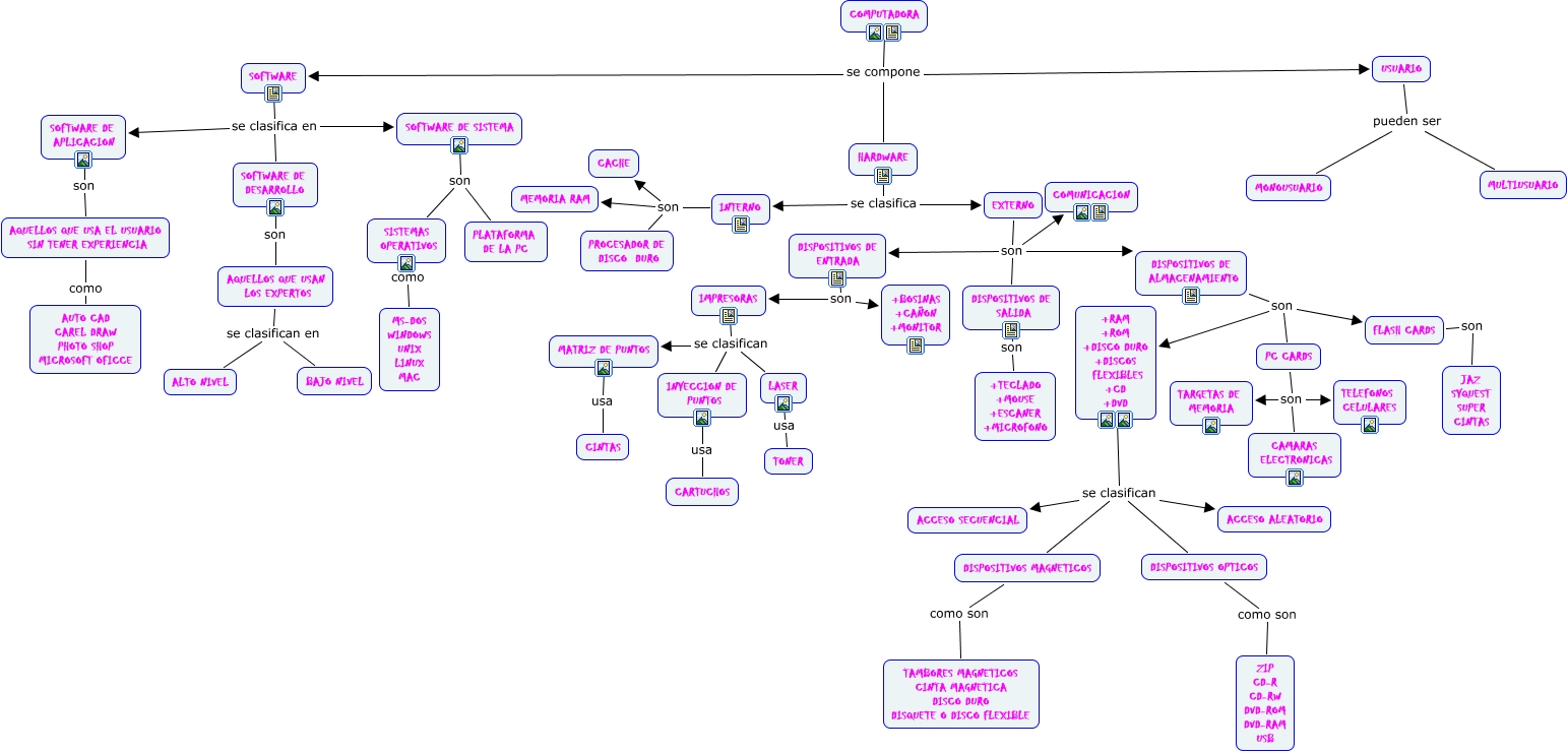 Este Cmap, tiene información relacionada con: MAPA TERMINADO, INTERNO son CACHE, INTERNO son MEMORIA RAM, DISPOSITIVOS DE ALMACENAMIENTO son PC CARDS, PC CARDS son TELEFONOS CELULARES, SOFTWARE DE SISTEMA son PLATAFORMA DE LA PC, USUARIO pueden ser MONOUSUARIO, SOFTWARE se clasifica en SOFTWARE DE DESARROLLO, IMPRESORAS se clasifican MATRIZ DE PUNTOS, AQUELLOS QUE USAN LOS EXPERTOS se clasifican en BAJO NIVEL, LASER usa TONER, PC CARDS son TARGETAS DE MEMORIA, MATRIZ DE PUNTOS usa CINTAS, SOFTWARE se clasifica en SOFTWARE DE SISTEMA, SISTEMAS OPERATIVOS como MS-DOS WINDOWS UNIX LINUX MAC, DISPOSITIVOS MAGNETICOS como son TAMBORES MAGNETICOS CINTA MAGNETICA DISCO DURO DISQUETE O DISCO FLEXIBLE, EXTERNO son COMUNICACION, EXTERNO son DISPOSITIVOS DE ALMACENAMIENTO, INYECCION DE PUNTOS usa CARTUCHOS, PC CARDS son CAMARAS ELECTRONICAS, +RAM +ROM +DISCO DURO +DISCOS FLEXIBLES +CD +DVD se clasifican DISPOSITIVOS MAGNETICOS