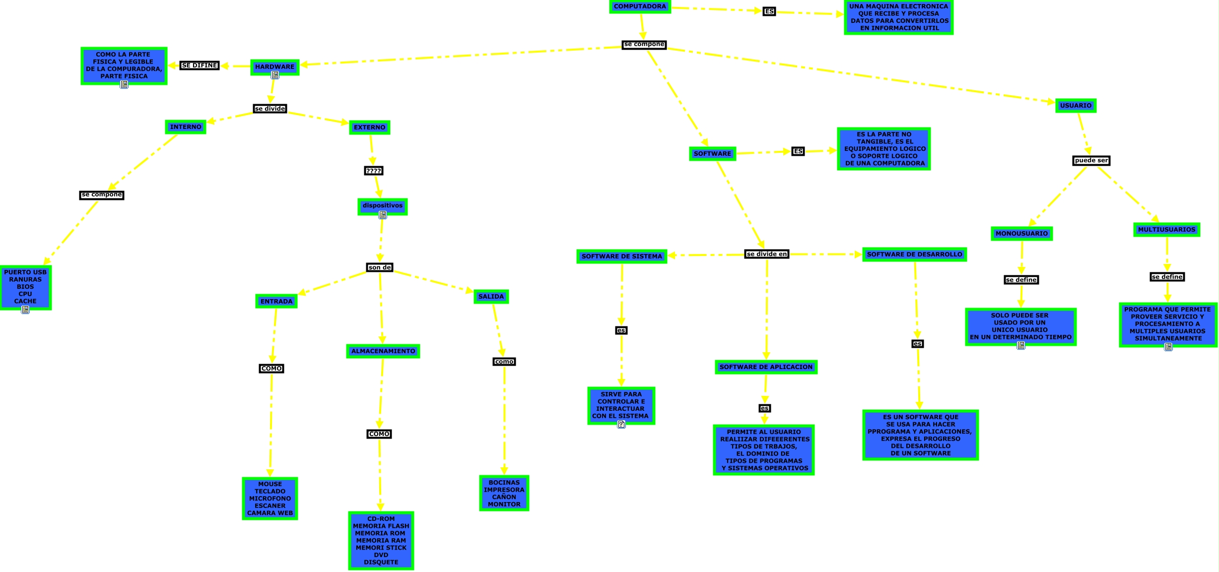 Este Cmap, tiene información relacionada con: Jharely Reyes Galicia NL36, SOFTWARE se divide en SOFTWARE DE DESARROLLO, ALMACENAMIENTO COMO CD-ROM MEMORIA FLASH MEMORIA ROM MEMORIA RAM MEMORI STICK DVD DISQUETE, COMPUTADORA se compone HARDWARE, SOFTWARE DE DESARROLLO es ES UN SOFTWARE QUE SE USA PARA HACER PPROGRAMA Y APLICACIONES, EXPRESA EL PROGRESO DEL DESARROLLO DE UN SOFTWARE, ENTRADA COMO MOUSE TECLADO MICROFONO ESCANER CAMARA WEB, dispositivos son de SALIDA, SOFTWARE se divide en SOFTWARE DE APLICACION, HARDWARE se divide EXTERNO, USUARIO puede ser MULTIUSUARIOS, dispositivos son de ALMACENAMIENTO, USUARIO puede ser MONOUSUARIO, MULTIUSUARIOS se define PROGRAMA QUE PERMITE PROVEER SERVICIO Y PROCESAMIENTO A MULTIPLES USUARIOS SIMULTANEAMENTE, SOFTWARE ES ES LA PARTE NO TANGIBLE, ES EL EQUIPAMIENTO LOGICO O SOPORTE LOGICO DE UNA COMPUTADORA, SALIDA como BOCINAS IMPRESORA CAÑON MONITOR, EXTERNO ???? dispositivos, SOFTWARE DE APLICACION es PERMITE AL USUARIO REALIIZAR DIFEEERENTES TIPOS DE TRBAJOS, EL DOMINIO DE TIPOS DE PROGRAMAS Y SISTEMAS OPERATIVOS, SOFTWARE DE SISTEMA es SIRVE PARA CONTROLAR E INTERACTUAR CON EL SISTEMA, SOFTWARE se divide en SOFTWARE DE SISTEMA, dispositivos son de ENTRADA, COMPUTADORA se compone SOFTWARE