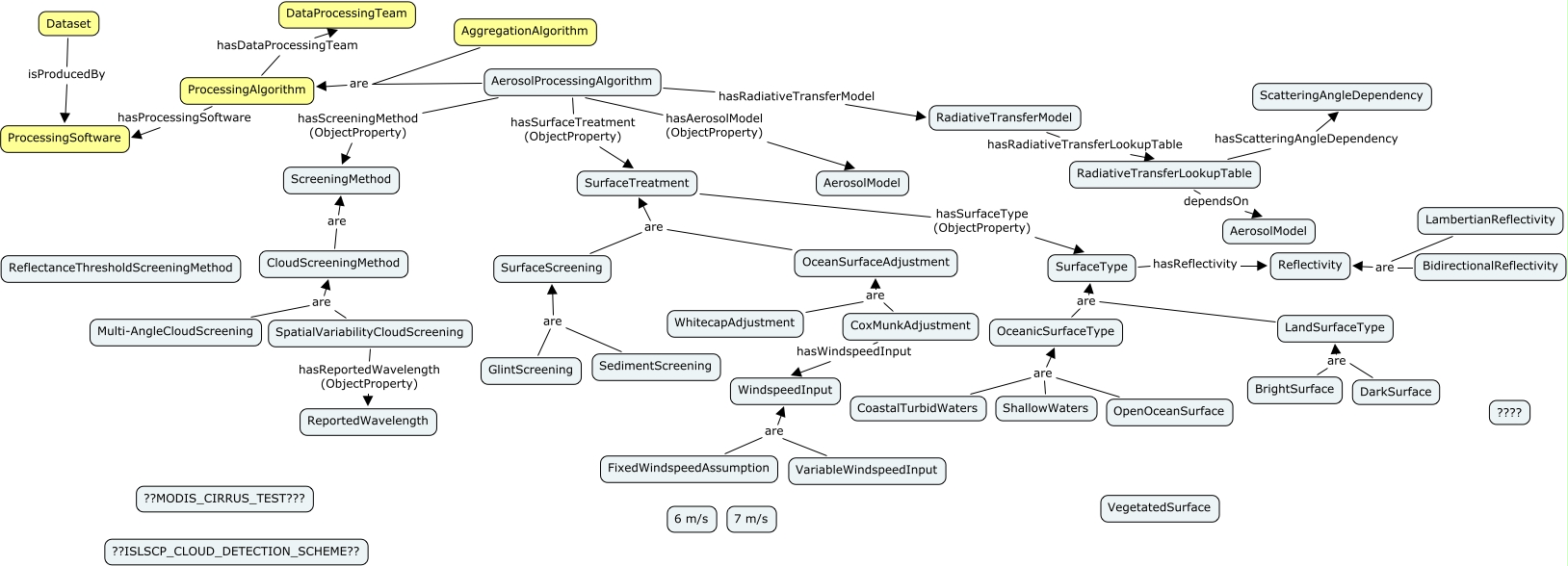 This Concept Map, created with IHMC CmapTools, has information related to: MDSA_Aerosol_Algorithms_v2, CoxMunkAdjustment hasWindspeedInput WindspeedInput, GlintScreening are SurfaceScreening, AerosolProcessingAlgorithm hasScreeningMethod (ObjectProperty) ScreeningMethod, SpatialVariabilityCloudScreening hasReportedWavelength (ObjectProperty) ReportedWavelength, SurfaceScreening are SurfaceTreatment, AggregationAlgorithm are ProcessingAlgorithm, ProcessingAlgorithm hasDataProcessingTeam DataProcessingTeam, FixedWindspeedAssumption are WindspeedInput, Dataset isProducedBy ProcessingSoftware, CoxMunkAdjustment are OceanSurfaceAdjustment, LandSurfaceType are SurfaceType, SurfaceType hasReflectivity Reflectivity, ShallowWaters are OceanicSurfaceType, LambertianReflectivity are Reflectivity, OceanicSurfaceType are SurfaceType, WhitecapAdjustment are OceanSurfaceAdjustment, RadiativeTransferModel hasRadiativeTransferLookupTable RadiativeTransferLookupTable, DarkSurface are LandSurfaceType, ProcessingAlgorithm hasProcessingSoftware ProcessingSoftware, RadiativeTransferLookupTable hasScatteringAngleDependency ScatteringAngleDependency
