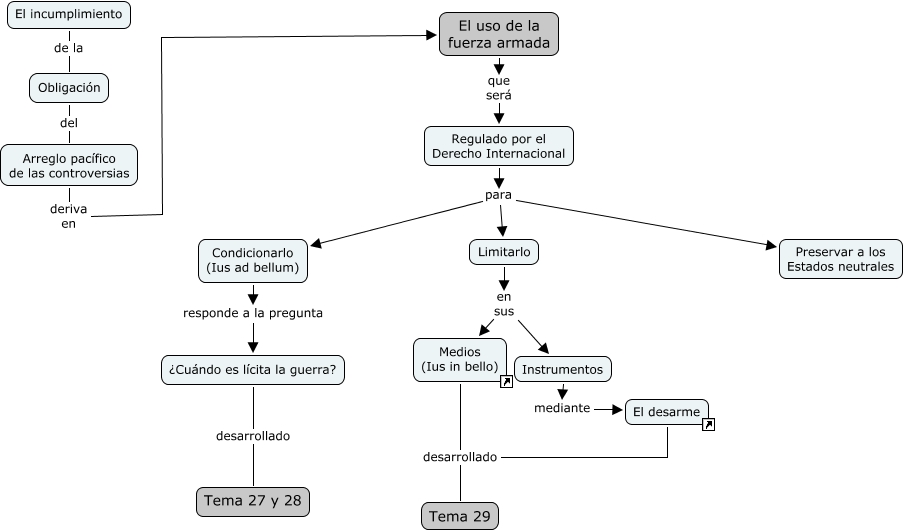 Este Cmap, tiene información relacionada con: Medidas tendentes para evitar conflictos armados, Regulado por el Derecho Internacional para Limitarlo, Instrumentos mediante El desarme, Arreglo pacífico de las controversias deriva en El uso de la fuerza armada, Regulado por el Derecho Internacional para Condicionarlo (Ius ad bellum), Limitarlo en sus Instrumentos, El uso de la fuerza armada que será Regulado por el Derecho Internacional, Medios (Ius in bello) desarrollado Tema 29, Limitarlo en sus Medios (Ius in bello), El incumplimiento de la Obligación, Condicionarlo (Ius ad bellum) responde a la pregunta ¿Cuándo es lícita la guerra?, Regulado por el Derecho Internacional para Preservar a los Estados neutrales, ¿Cuándo es lícita la guerra? desarrollado Tema 27 y 28, Obligación del Arreglo pacífico de las controversias, El desarme desarrollado Tema 29