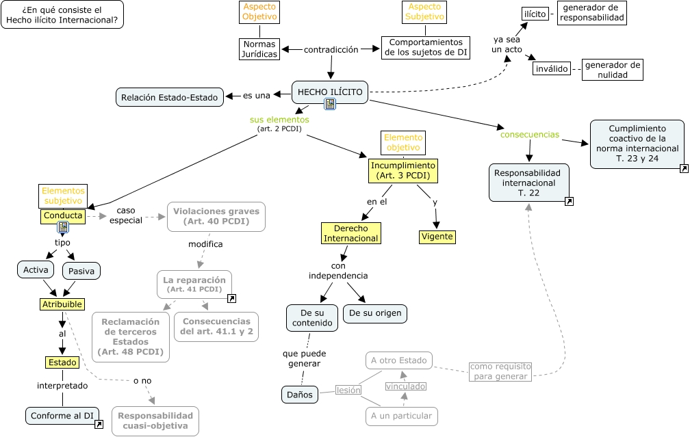 Este Cmap, tiene información relacionada con: Tema 21_introduccion, Daños lesión A otro Estado, Conducta Elementos subjetivo, Activa Atribuible, inválido generador de nulidad, HECHO ILÍCITO ya sea un acto ilícito, Atribuible o no Responsabilidad cuasi-objetiva, HECHO ILÍCITO sus elementos (art. 2 PCDI) Conducta, Conducta tipo Activa, De su contenido que puede generar Daños, Atribuible al Estado, Incumplimiento (Art. 3 PCDI) en el Derecho Internacional, Aspecto Subjetivo Comportamientos de los sujetos de DI, HECHO ILÍCITO consecuencias Responsabilidad internacional T. 22, Violaciones graves (Art. 40 PCDI) modifica La reparación (Art. 41 PCDI), Conducta tipo Pasiva, Derecho Internacional con independencia De su contenido, Incumplimiento (Art. 3 PCDI) Elemento objetivo, Pasiva Atribuible, Estado interpretado Conforme al DI, HECHO ILÍCITO es una Relación Estado-Estado